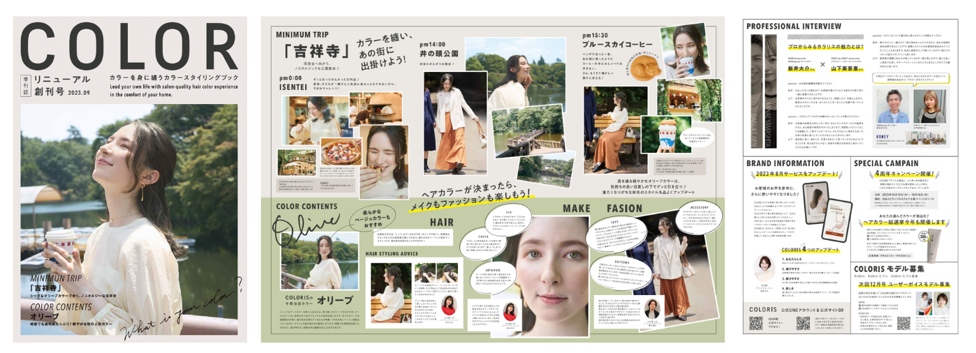 リニューアル創刊号のテーマは、「カラーを身に纏うカラースタイリングブック」。セルフカラーで自分らしい髪色を纏う楽しさをビジュアルで表現した特集では、これまでにはなかった「メイク」や「ファッション」にも触れています。ユーザーインタビュー、ヘアケアについてのQ&Aなどを掲載しています。