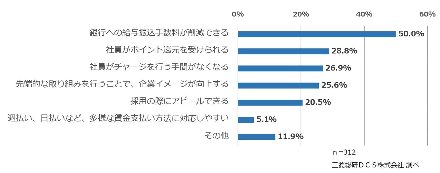 「銀行への給与振込手数料が削減できる」が50%と最も多く、「社員がポイント還元を受けられる」28.8%、「社員がチャージを行う手間がなくなる」26.9%と続きます。自社もしくは従業員にもたらされる具体的な経済的効果が、多くの企業でメリットと考えられています。