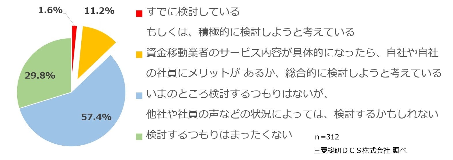 「資金移動業者のサービス内容が具体的になったら、自社や自社の社員にメリットがあるか、総合的に検討しようと考えている」が11.2%。計12.8%が各資金移動業者のサービス内容が明らかになれば、比較的早い時期の検討を考えていることが分かりました。