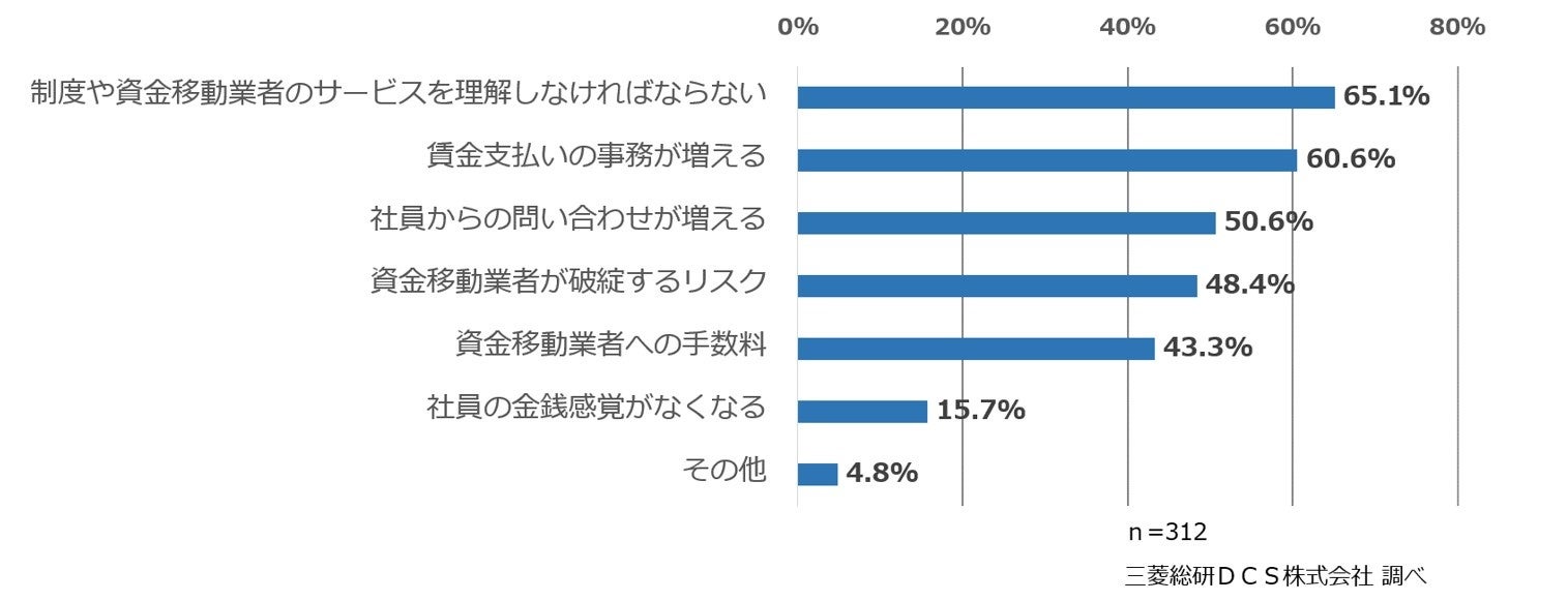 「資金移動業者が破綻するリスク」も48.4%の企業が選択しており、破綻した場合に実際どう保証されるかが明示されていないなか、デメリットと考える企業が半数にのぼりました。また、「資金移動業者への手数料」も43.3%と半数弱の企業が選択しました。