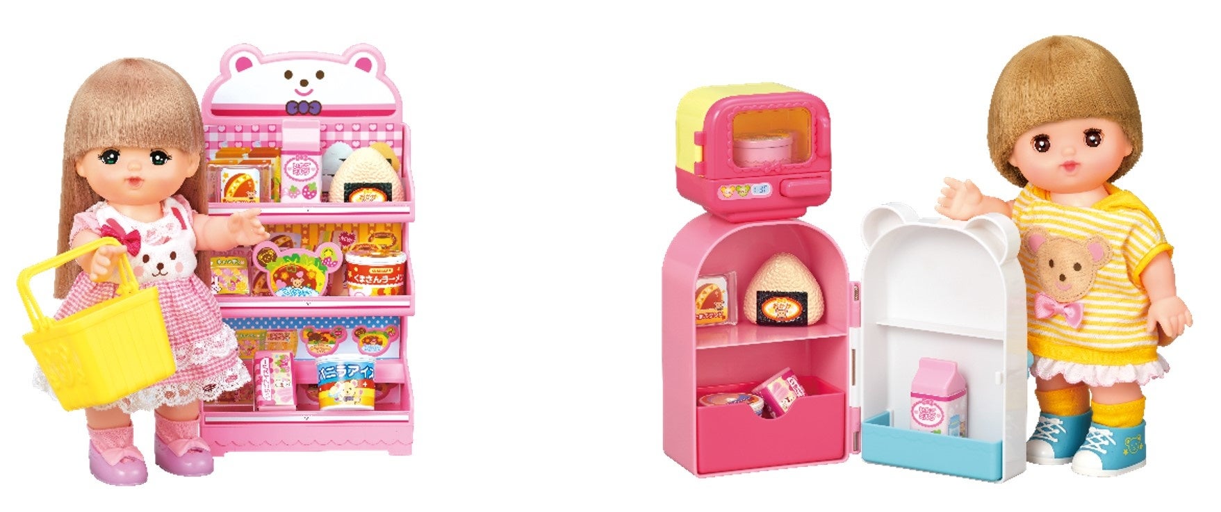 コンビニの人気のたべものパーツ8種がたのしめる、コンビニたべものセットが新しく登場。くまさんコンビニと一緒に遊ぶことができます。たくさんのたべものをメルちゃんにぜひ食べさせてあげてくださいね。