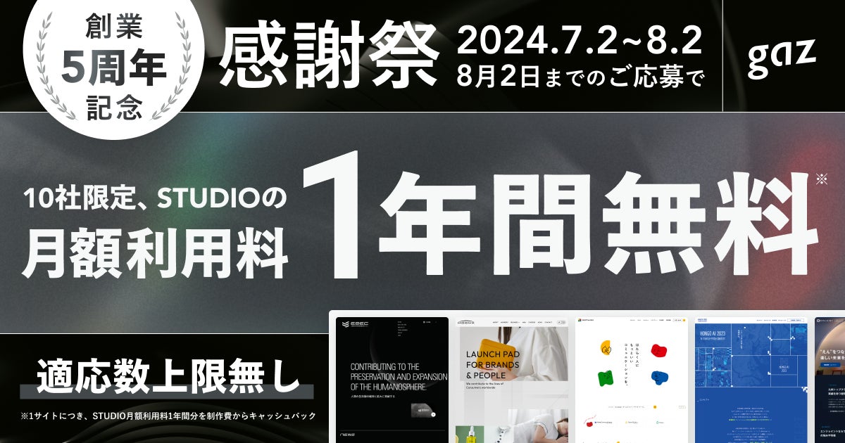 総合的なデザイン支援を行う、株式会社gaz (読み方:ギャズ、以下 gaz)は創業5周年の感謝祭として、ノーコードWeb制作プラットフォーム「STUDIO ( https://studio.design/ja )」のStarterプラン・CMSプラン・Businessプランを対象に、gazへWebサイト制作をご依頼いただいた10社限定で『STUDIO月額利用料1年間実質無料*キャンペーン』を実施いたします。