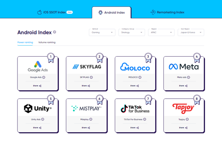 広告効果の質を測るパワーランキングと、量を測るボリュームランキングにおいて、『SKYFLAG』は日本・韓国エリアのゲームカテゴリ(Android版)3部門でのランクインを果たしました。