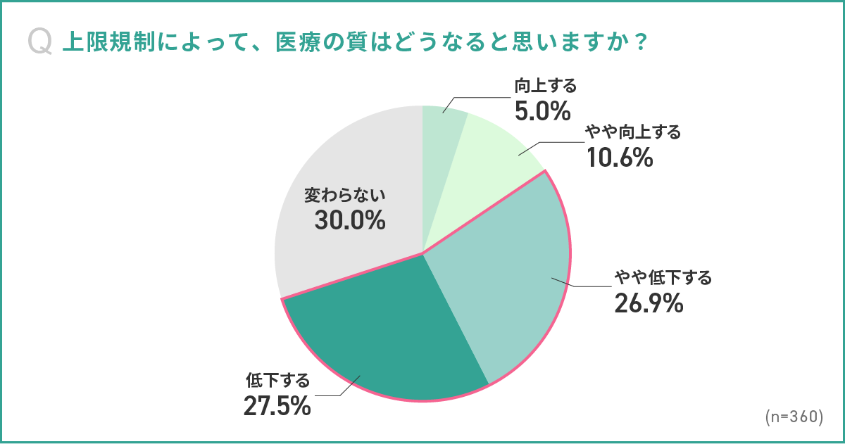 「時間外労働(残業)の上限規制によって、医療の質はどうなると思いますか」との質問に対し回答は、「低下する」27.5%、「やや低下する」26.9%、「向上する」5.0%、「やや向上する」10.6%、「変わらない」30.0%で、半数以上となる54.4%が医療の質が低下すると回答した。