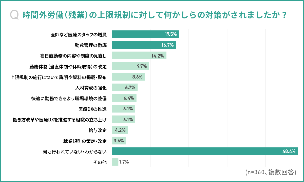 「勤務先で、時間外労働(残業)の上限規制に対して何かしらの対策がされましたか」との質問に対し回答は、最多が「何も行われていない・わからない」48.4%、次いで「医師など医療スタッフの増員」17.5%、「勤怠管理の徹底」16.7%だった。