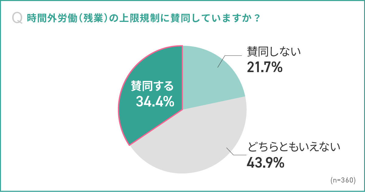 ② 時間外労働の上限規制に「賛同しない」21.7%、「どちらともいえない」43.9%、「賛同する」34.4%。