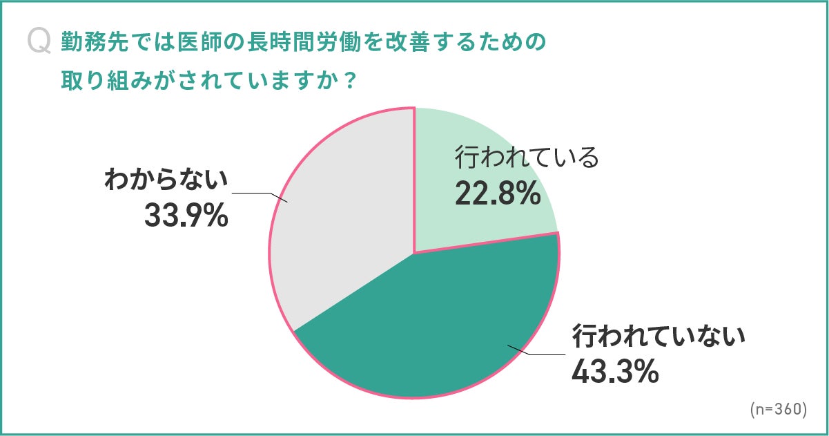 「勤務先では医師の長時間労働を改善するための院内ルールの策定など、何か取り組みが行われていますか」の質問に対し回答は、「行われている」22.8%、「わからない」33.9%、「行われていない」43.3%だった。取り組みがされていない・わからないが77.2%で、医師の長時間労働を積極的に改善しようとする動きがまだ少ない様子がうかがえる。