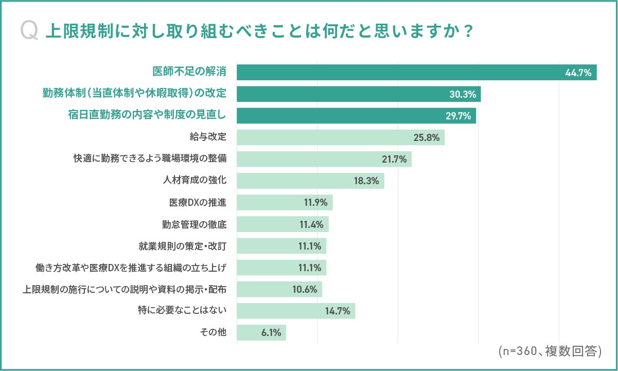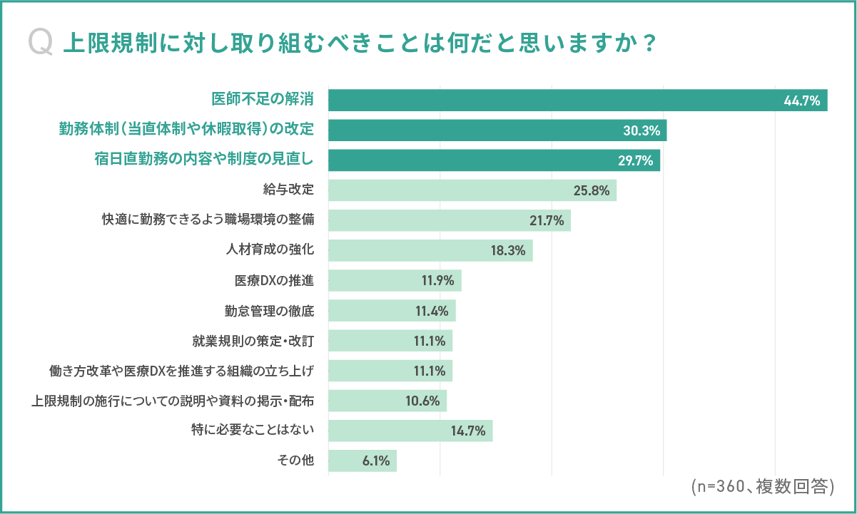 「時間外労働(残業)の上限規制に対し、勤務先で取り組むべきことは何だと思いますか」の質問に対し回答は、最多が「医師不足の解消」44.7%、次いで「勤務体制(当直体制や休暇取得)の改定」30.3%、「宿日直勤務の内容や制度の見直し」29.7%だった。