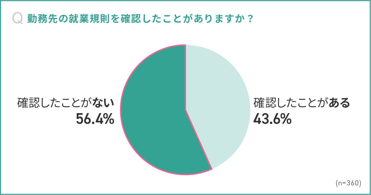 「勤務先の就業規則を見たことがありますか」との質問に対し回答は、「見たことがない」56.4%、「見たことがある」43.6%だった。上限規制の施行に対し、勤務体制(当直体制や休暇取得)の改定に取り組むべきとの声があがった一方で、社内規程や社内ルールなどを把握できていない様子がうかがえる。