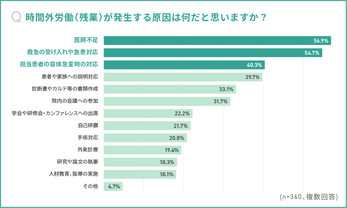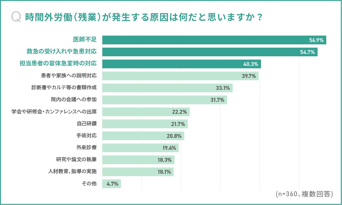 「時間外労働(残業)が発生する原因は何だと思いますか」との質問に対し回答は、最多が「医師不足」56.9%、次いで「救急の受け入れや急患対応」54.7%、「担当患者の容態急変時の対応」40.3%だった。救急の受け入れや患者の急変時の対応など、やむを得ない理由が上位で残業が発生していることからも、医師不足の解決が求められる。
