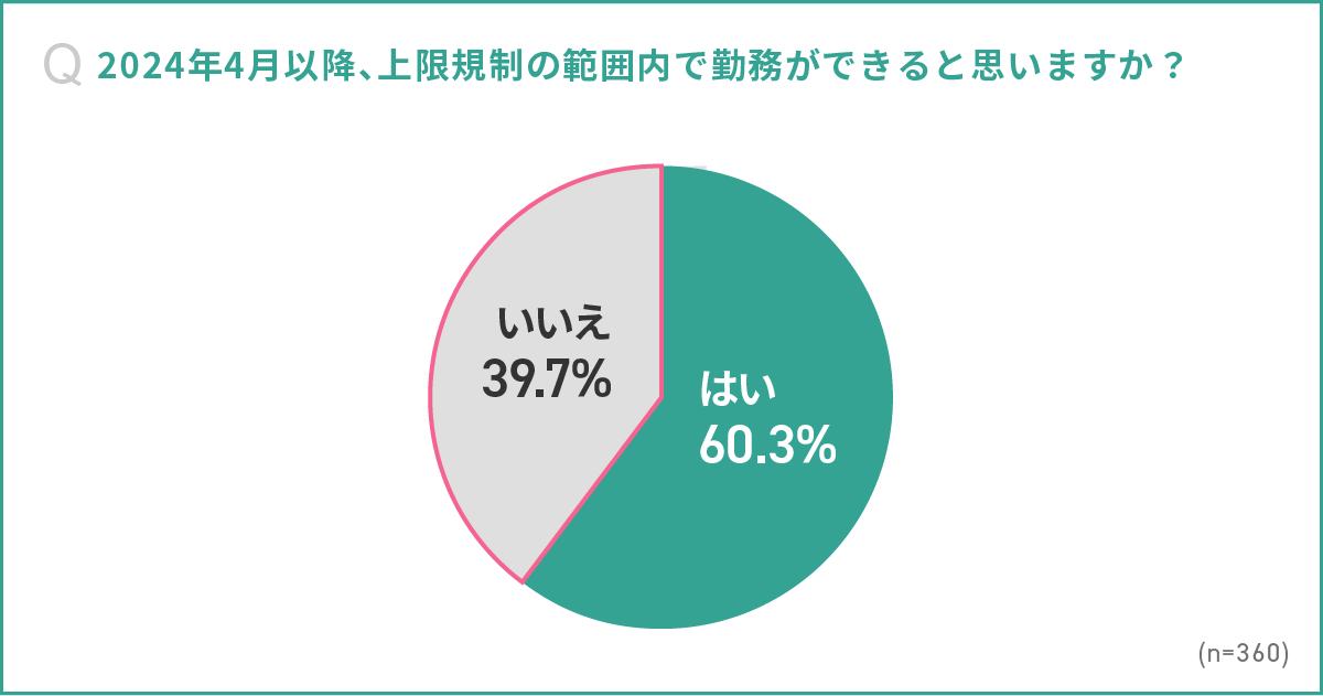 「2024年4月に時間外労働(残業)の上限規制が施行された後、この上限規制の範囲内で勤務ができると思いますか」の質問に対し回答は、「勤務できない」39.7%が、「勤務できる」60.3%だった。このままでは約4割が時間外労働の上限規制違反となる可能性がある。