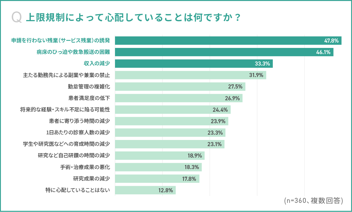 「時間外労働(残業)の上限規制によって心配していることは何ですか」との質問に対し回答は「申請を行わない残業(サービス残業)の誘発」47.8%、次いで「病床のひっ迫や救急搬送の困難」46.1%、「収入の減少」33.3%、「主たる勤務先による副業や兼業の禁止」31.9%だった。