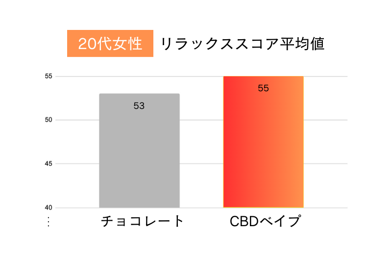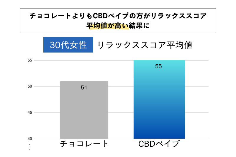 CBD40%濃度ベイプを使用した今回の検証では、チョコレートよりもCBDベイプのリラックススコアが総じて高いことがわかりました。