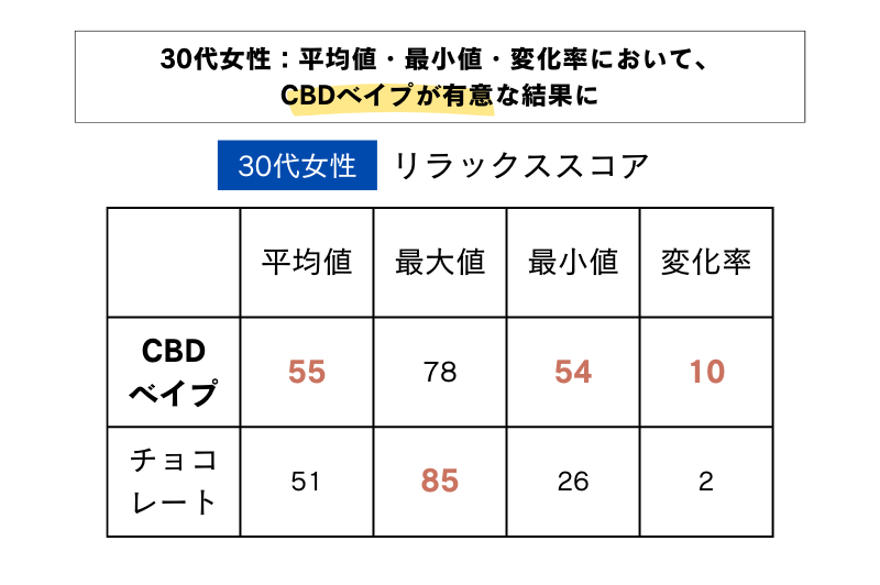 また、表1より、30代女性においては、リラックススコア最大値はチョコレートの方が高いスコアを示したものの、最小値・平均値・変化率はCBDベイプの方が高いスコアを示しており、CBDベイプの安定的なリラックス効果を示す結果となりました。