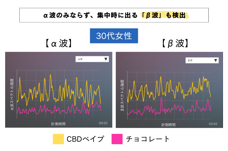 30代女性においては、CBDベイプ使用後にα波が高いスコアを示すと同時に、β波も検出されました。