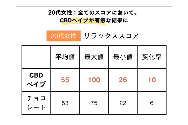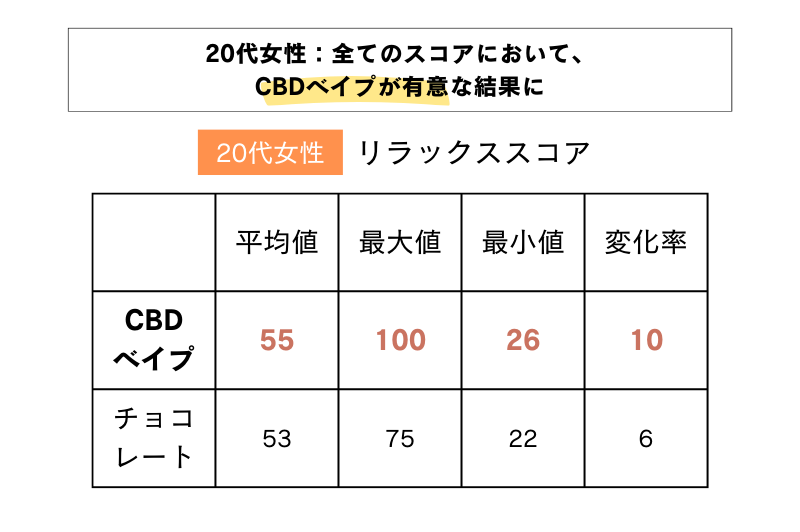 表2より、20代女性は全てのスコアにおいて、チョコレートよりもCBDベイプのリラックススコアが有意な結果となりました。チョコレートは、全ての計測値において低い結果となったため、それほど強いリラックス効果を得られていないことがわかりました。