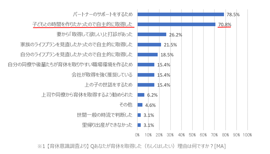 ※1参照:江崎グリコ株式会社・育休コミュニティ「MIRAIS」調べ「男性育休取得者、および取得予定者とそのパートナーへの育休意識調査」