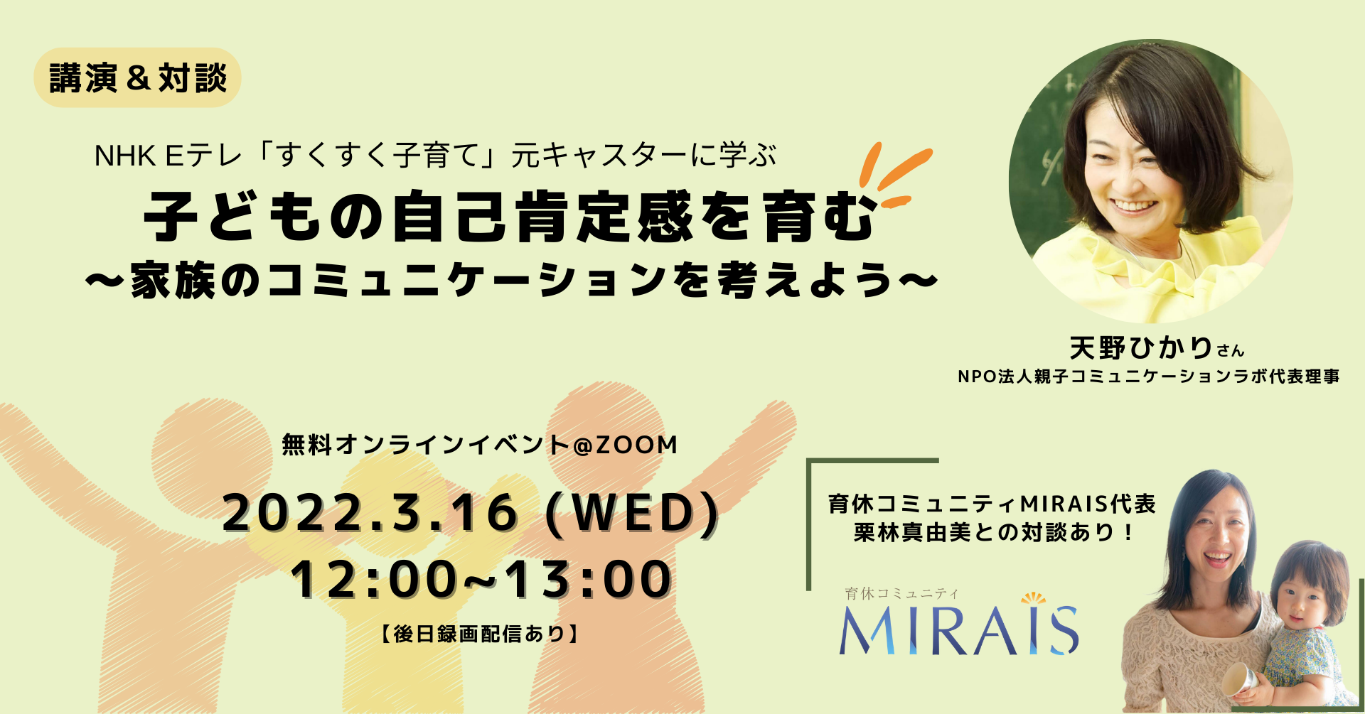 育休コミュニティ MIRAIS(ミライズ)(以下、MIRAIS)は、3月16日(水)にNPO法人親子コミュニケーションラボ代表理事でありNHK Eテレ「すくすく子育て」元キャスターの天野ひかりさんをゲストにお招きし、オンライントークイベント「子どもの自己肯定感を育む~家族のコミュニケーションを考えよう~」を開催いたします。