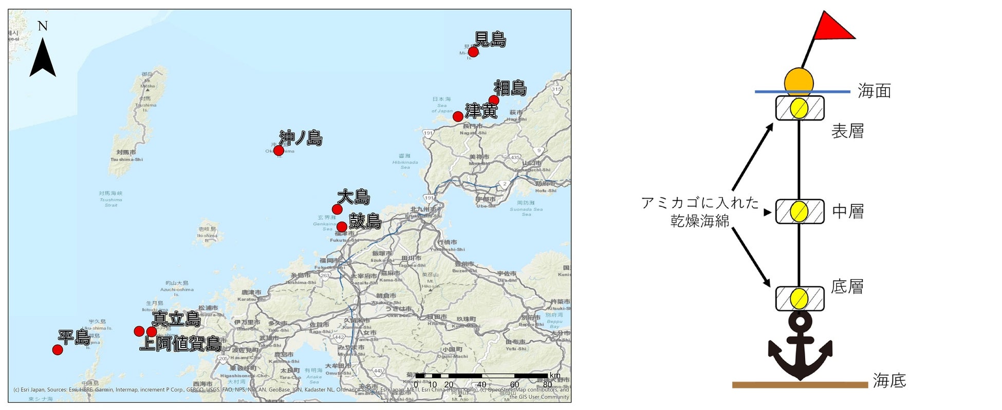 環境DNA分析は生物の生息域の水を汲むだけで分析ができる効率性の高さの反面、玄界灘のように開放的な水域においては、少数かつ移動性の高い魚を検出し難い課題がありました。研究ではこうした魚類も高感度でモニタリング可能な手法として、乾燥海綿(パッシブサンプラー)を用いたモニタリング方法を模索。アンカーとブイとロープを使った調査器具を新たに作成しました。生態系の実態により詳細に迫るため、現場に根差した調査方法の開発にも熱心に取り組んでいます。