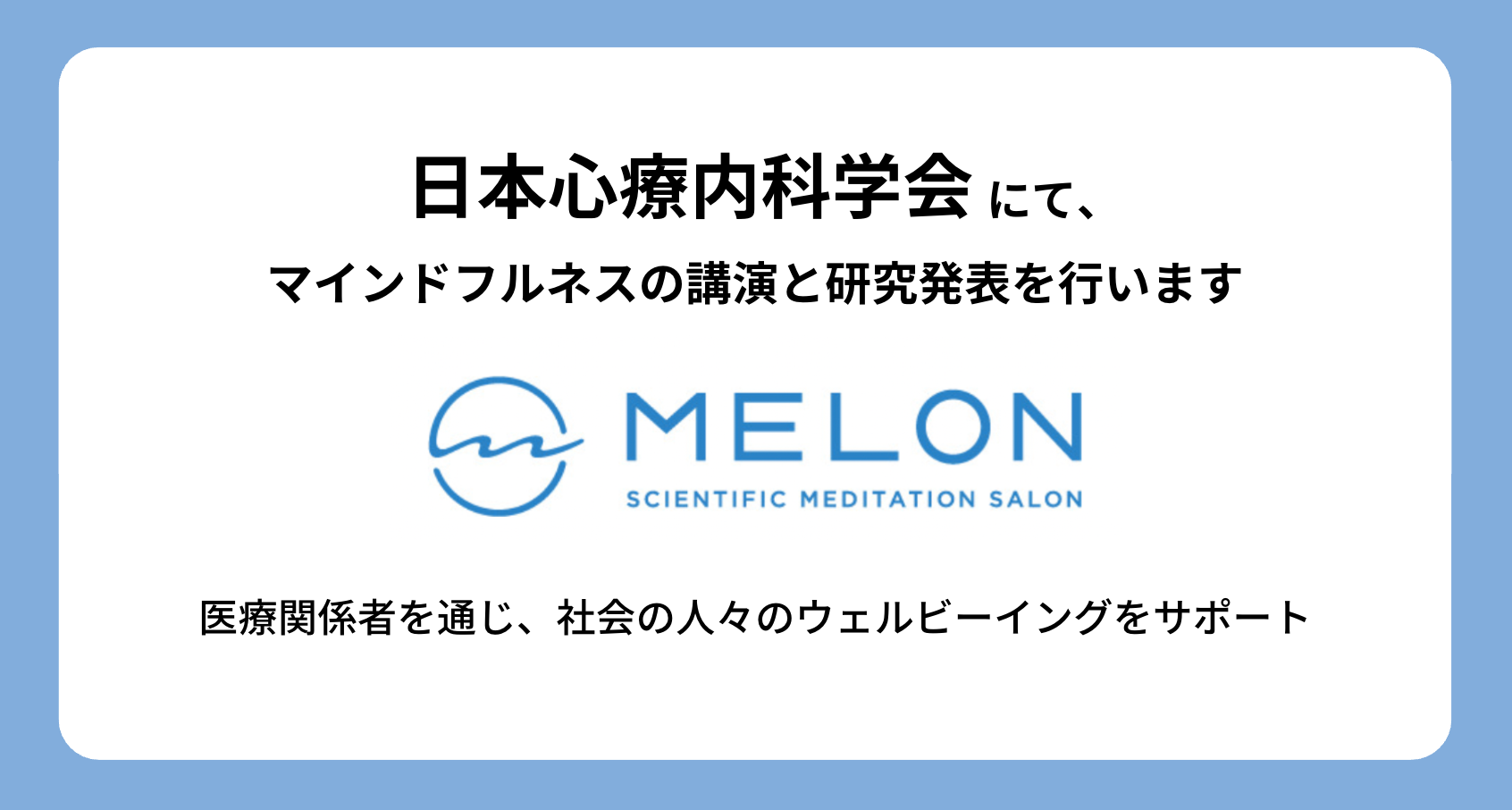 第27回日本心療内科学会総会・学術大会のテーマは「未来へ繋ぐ心療内科の叡智」です。MELONは、科学的なエビデンスのあるマインドフルネス(メディテーションを通じた脳と心のトレーニング法)を手軽に継続し、実践を重ねることができるプラットフォームを提供しています。その中で得た知見やデータを元にした効果的なメンタルヘルス対策を、これからの社会を生きる人々のウェルビーイング向上に繋げていきたいと考えています。
