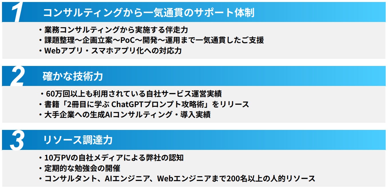 生成AI開発ラボは、以下のサービスを通じて企業をご支援いたします。