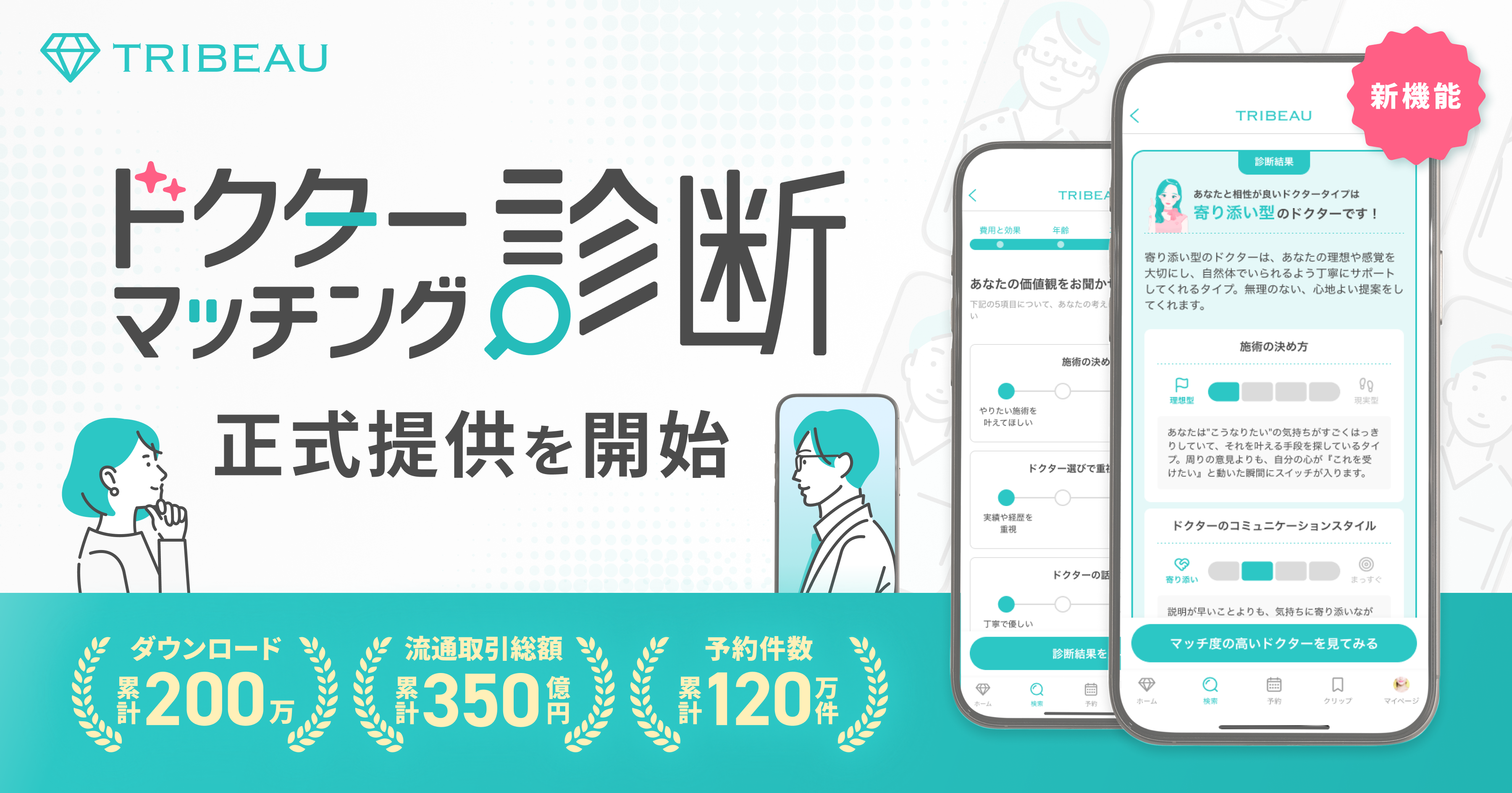 国内最大級の美容医療口コミ・予約アプリ『トリビュー』を開発・運営する、株式会社トリビュー(本社:東京都渋⾕区、代表取締役:⽑迪、以下 当社)は、2025年12月25日、新機能「ドクターマッチング診断」の正式提供を開始しました。本機能は、これまでに蓄積された口コミの内容・評価・件数に加え、ユーザー自身の価値観や重視ポイントをAIが解析することで、施術におけるコミュニケーションスタイルや症例傾向など、多面的な観点から“相性の良いドクター”を診断・提案するものです。“自分に本当に合うドクターと出会える体験”の提供を通して、美容外科領域における比較検討ハードルを下げ、より多くの人々が「ありたい自分」でいられる世界の実現を目指します。