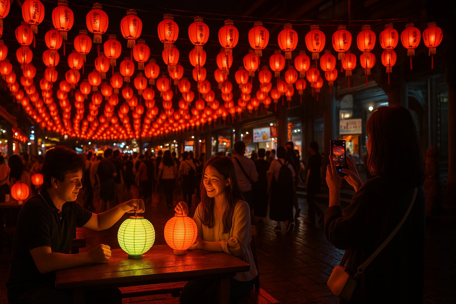 夜が深まるにつれ、その明かりがグルメや人の笑顔を包み込み、まるで台湾夜市に迷い込んだかのような世界に。