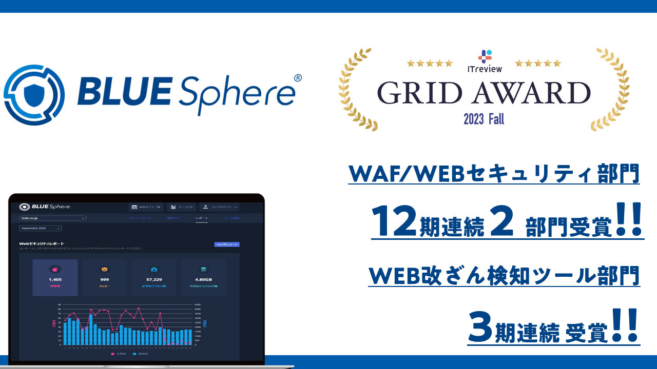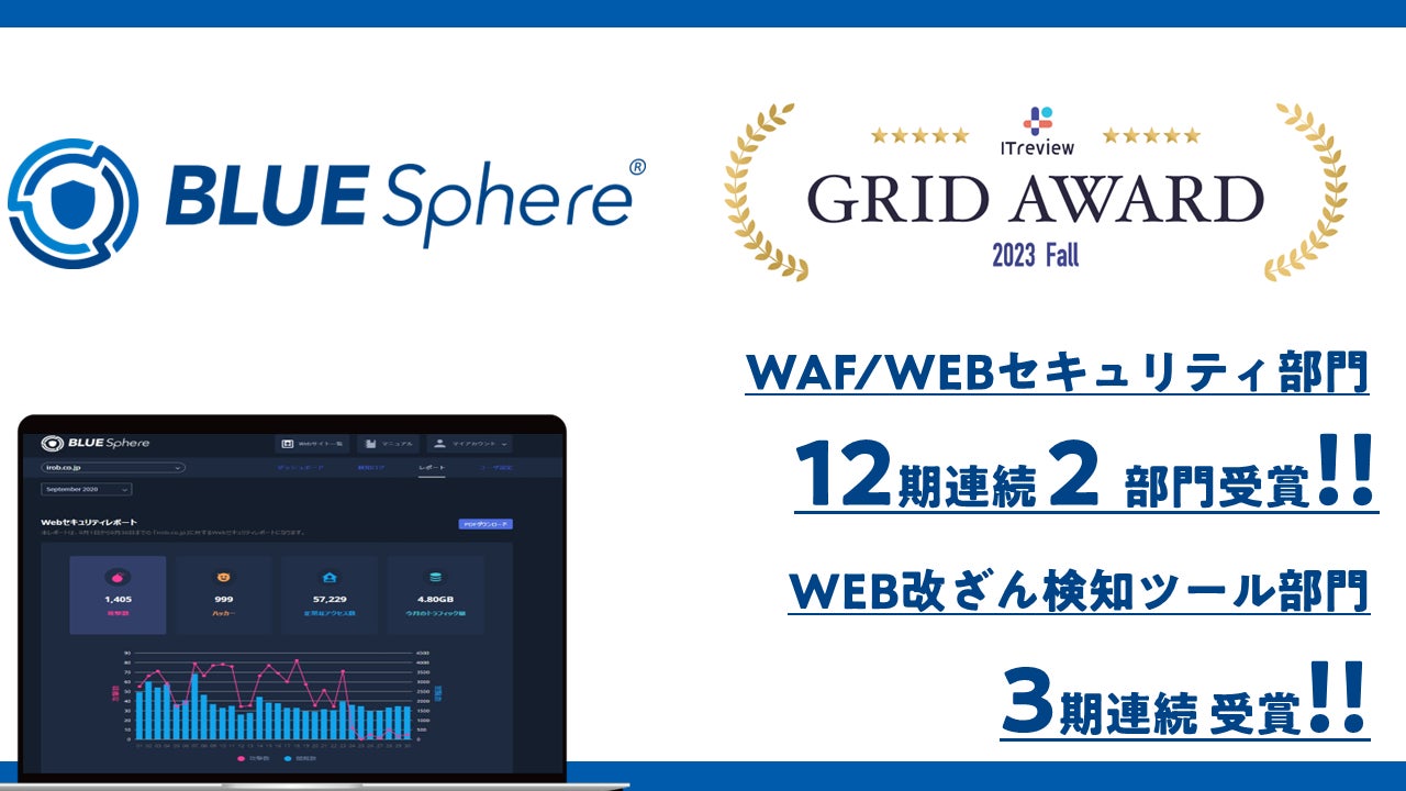 BLUE Sphere が ITreview Grid Awardの掲載サービスの中でも、顧客満足度と認知度の双方が特に高いサービスとして[ Leader ]を「Webセキュリティ部門」・「WAF部門」で12期連続、「Web改ざん検知ツール部門」では3期連続で受賞いたしました。