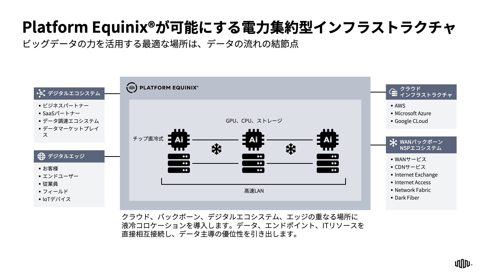 Platform Equinix®は、お客様のデータ活用の実現に必要なデジタルエコシステムへのアクセスを可能にするプラットフォームであり、クラウド、グローバルネットワークバックボーン、デジタルエコシステムおよびエッジなどの相互接続拠点に位置付けることで、高電力密度をサポートするデータセンターサービスを提供します。