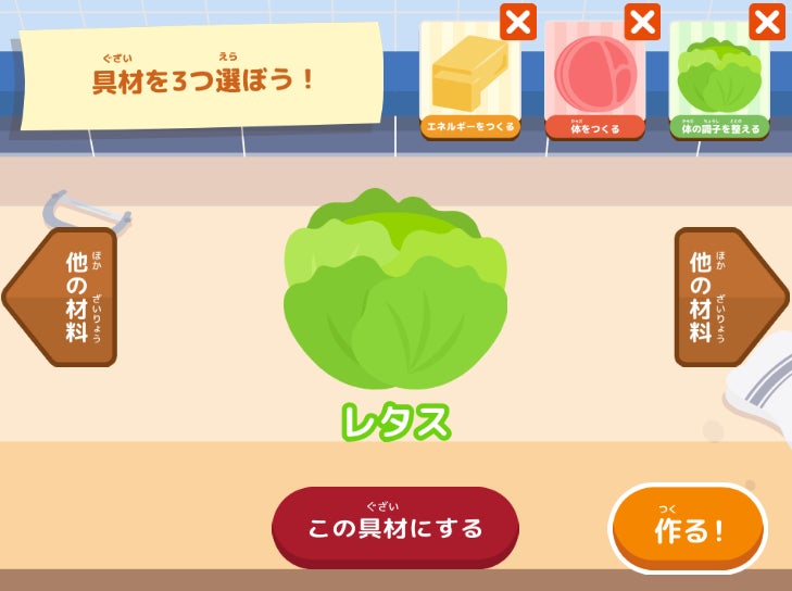 遊んでいるうちに「食べるものによって体の調子が変わるんだ」という気づきが自然と得られるようになっています。楽しみながら、栄養バランスの大切さを体感できるコンテンツです。