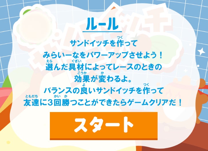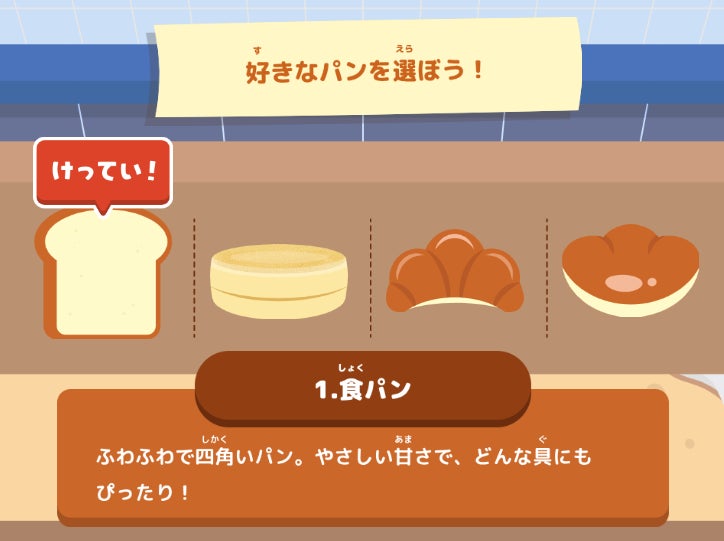 「好きな具材を選んでサンドイッチを作り、友だちと学校まで競争する」というシンプルで楽しい内容です。選んだ具材の“栄養バランス”によってキャラクターの動きが変わるところがポイント。