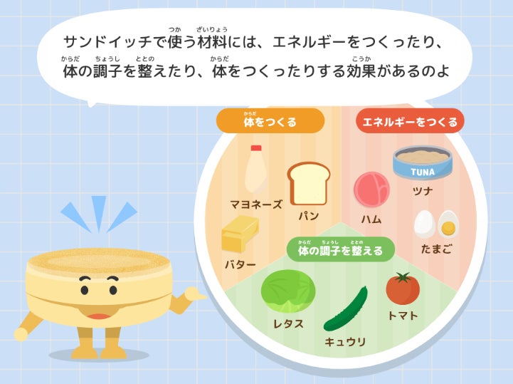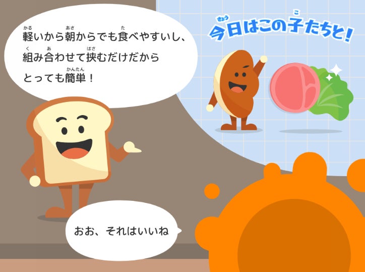 パンたちとのやりとりを通して、栄養バランスのとれたサンドイッチが手軽に作れて、朝食にぴったりであることを知ります。