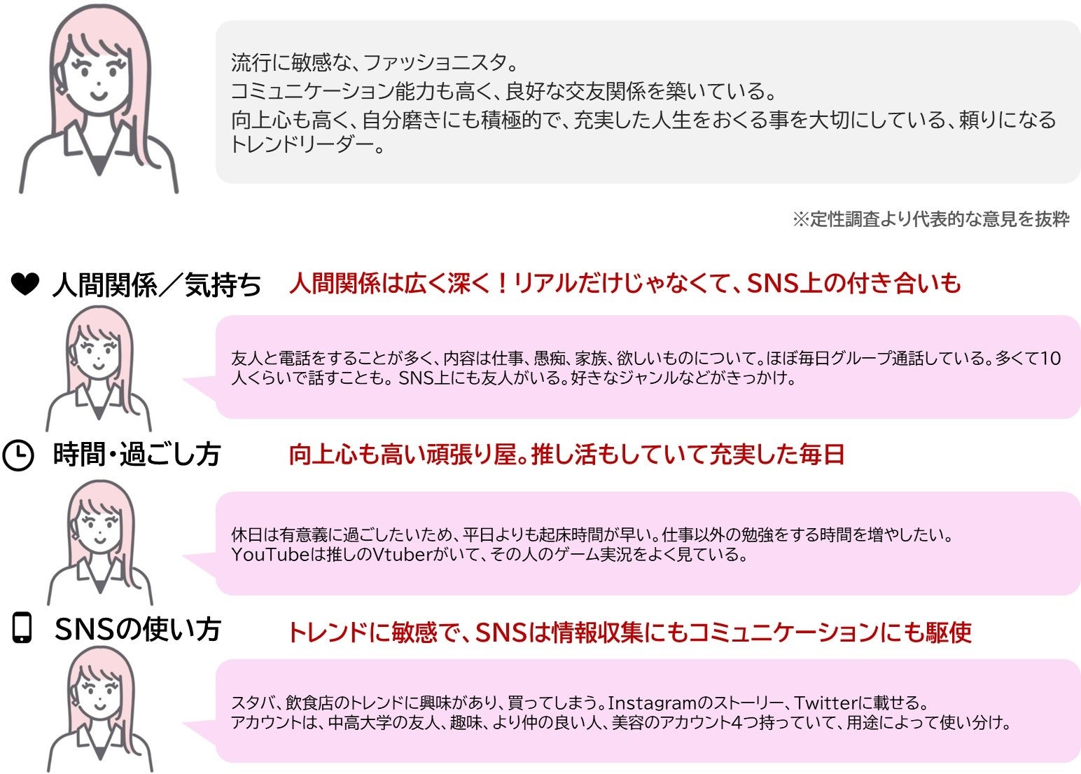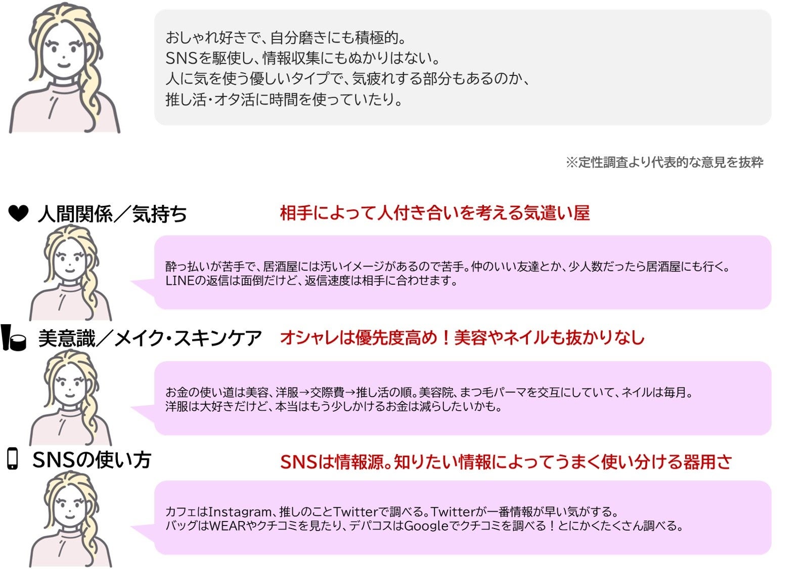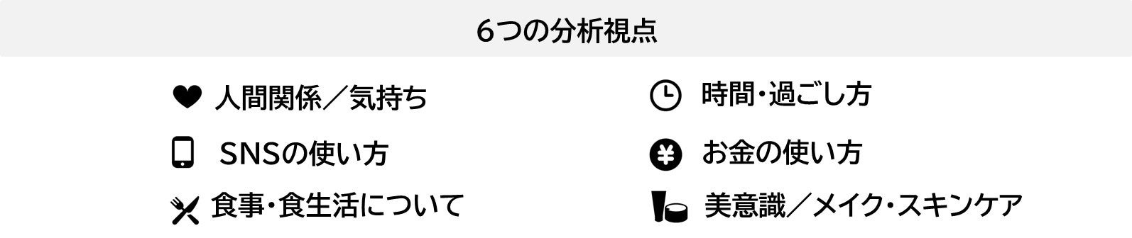 Z世代の抽出された各クラスターについては、その多様性を確認すべく、主に「人間関係/気持ち」「SNSの使い方」「食事・食生活について」「時間・過ごし方」「お金の使い方」「美意識/メイク・スキンケア」の6つの分析視点にて、特徴を確認しました。以下順番にクラスターごとの特徴をご紹介していきます。
