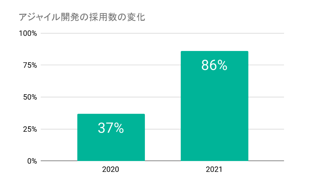 Digital.aiが2021年7月に発表したState of Agile Reportによると、グローバルのソフトウェア開発チームにおけるアジャイル開発の採用は、2020年時点の37%から2021年には86%へと49ポイント大きく増加しています。