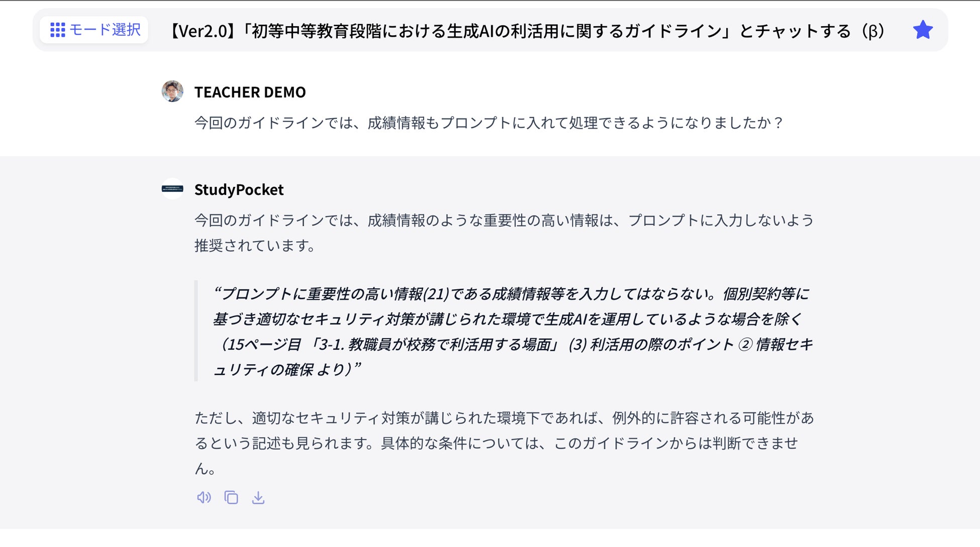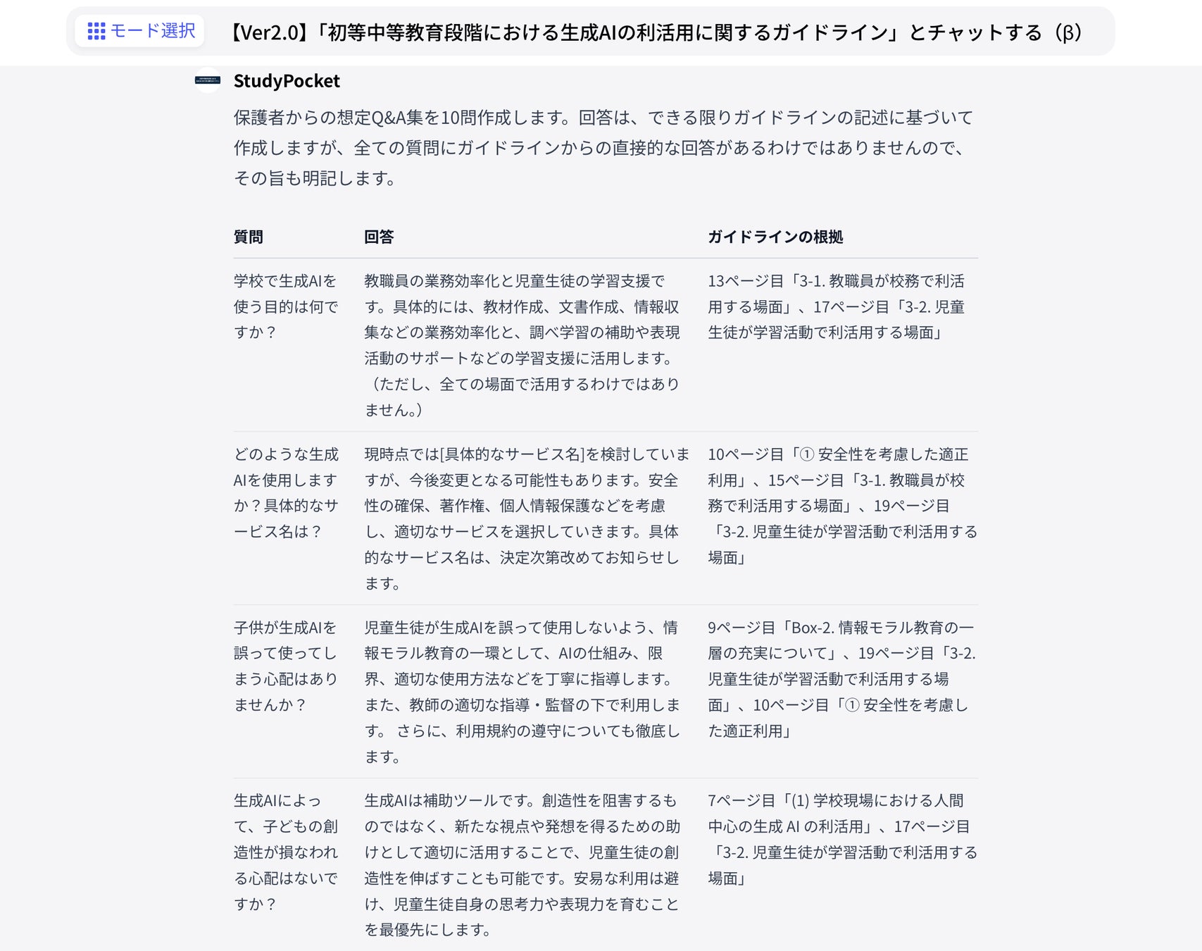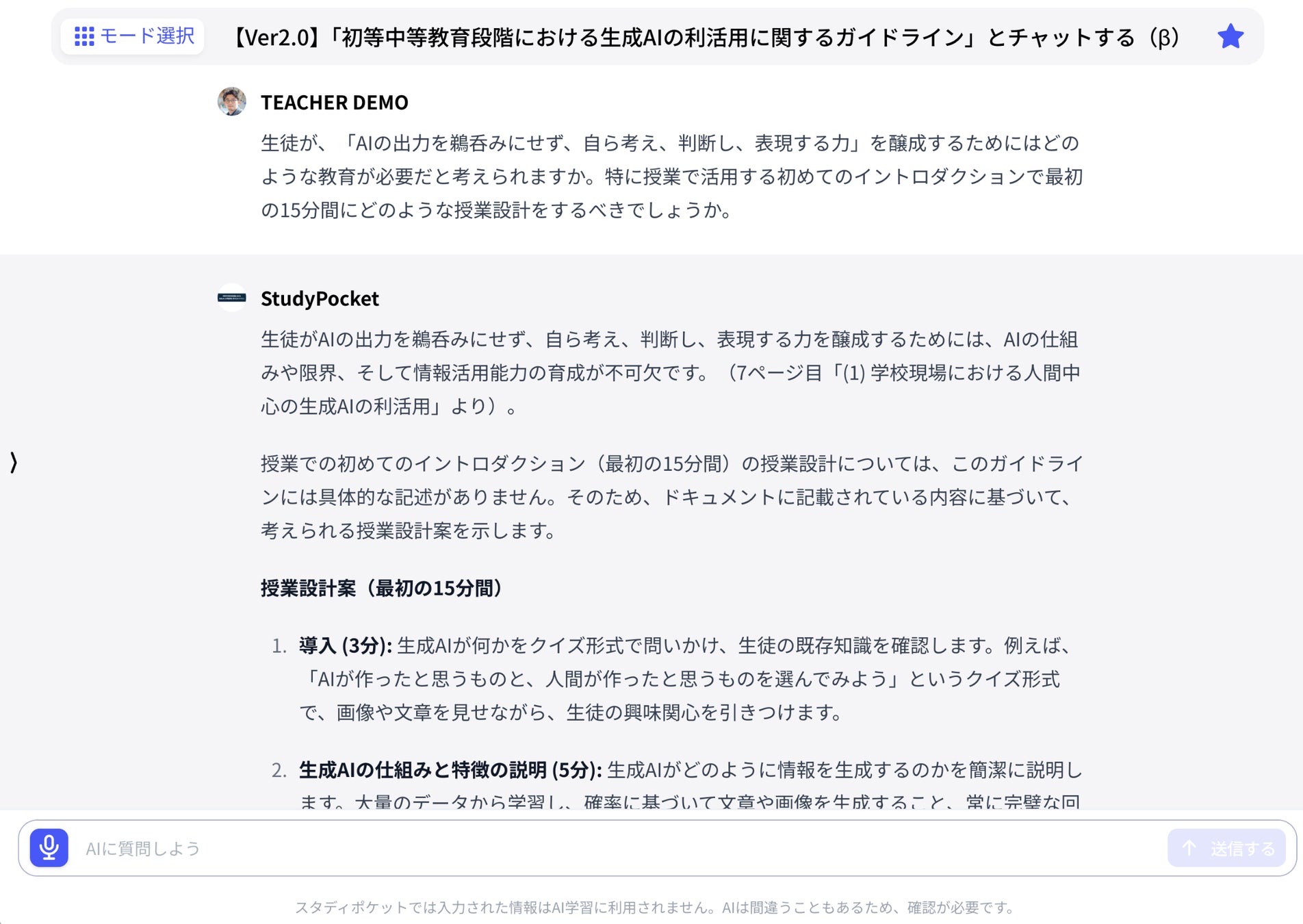 学校向け生成AIサービス「スタディポケット」、文部科学省『初等中等教育段階における生成AIの利活用に関するガイドライン』Ver2.0 の内容に基づいて応答するチャット機能を公開。