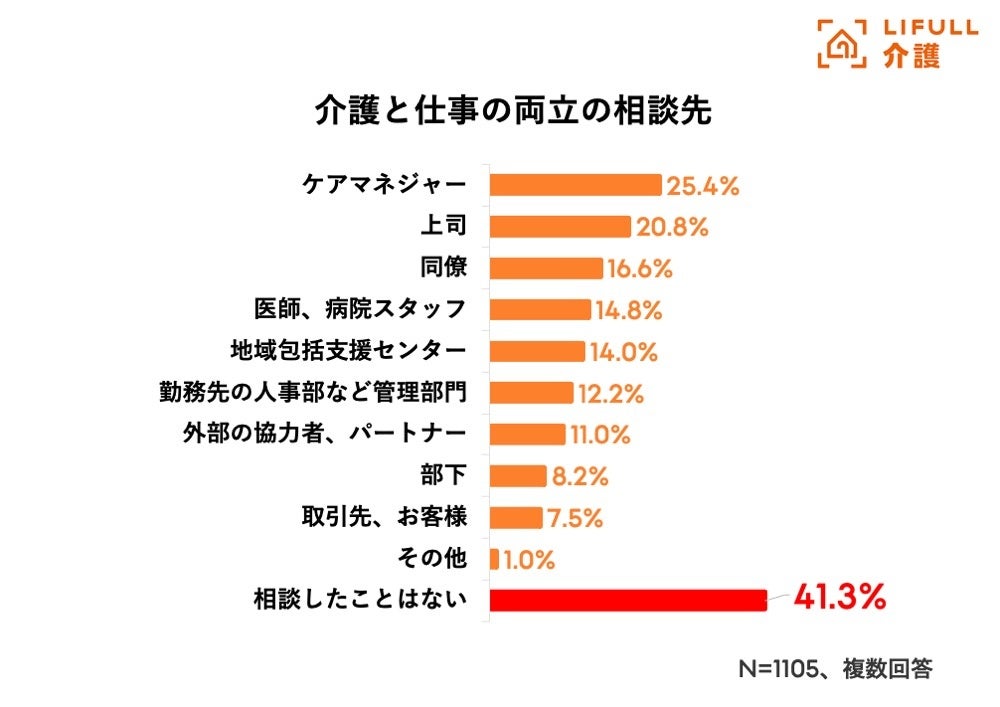 介護と仕事を続けるには、使っている介護サービスを調整する、あるいは職場に働き方を相談するなど、何らかの相談が必要になる場面もあるでしょう。介護と仕事の両立について誰かに相談したことがあるか、またその相談先をたずねたところ、最も多かった相談先はケアマネジャー(25.4%)でした。次に職場の上司(20.8%)、医師や病院スタッフ(14.8%)と続きます。