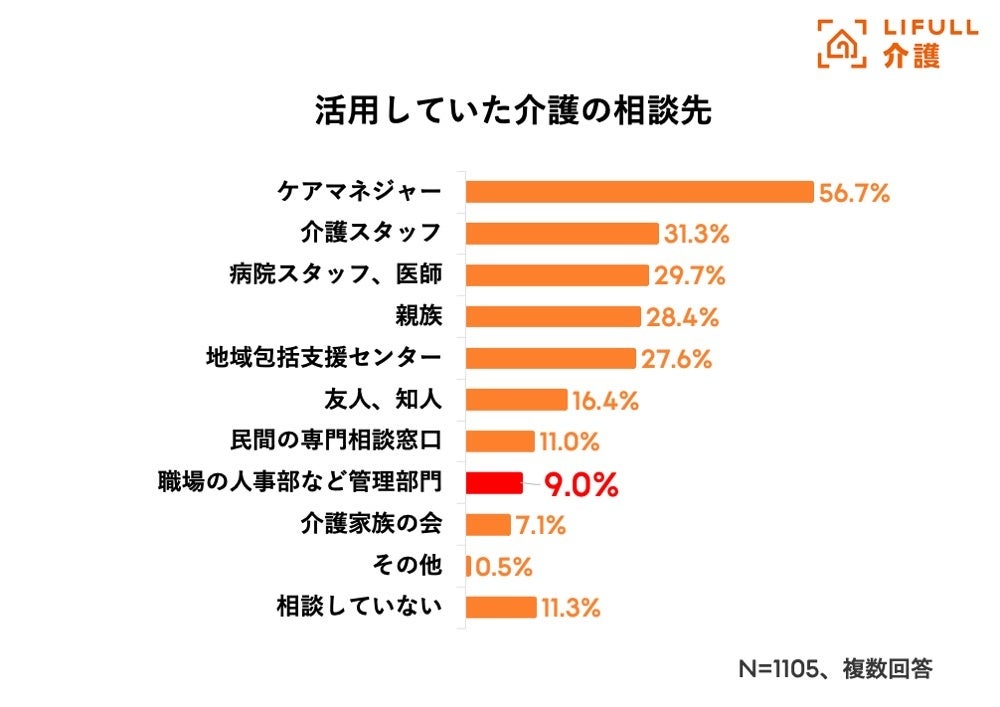 注目したいのは職場の人事部など管理部門(9.0%)です。近年は産業ケアマネジャーという、企業の顧問として介護と仕事の両立に専門的な指導や助言を行う有資格者に注目が集まっています。産業ケアマネジャーを配置する企業が増えると、介護のことを所属する企業に相談する人も増えていくかもしれません。