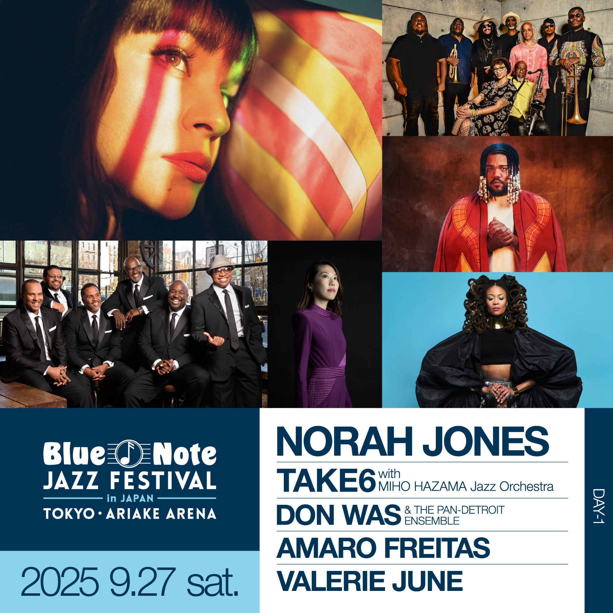 9⽉27⽇(⼟)は、アメリカーナ・ムーヴメントを代表するミュージシャン ヴァレリー・ジューン のステージから幕を開け、 ブラジル出⾝のルーツを⼤切にしながらあらゆるボーダーを超えて世界を熱狂させている、いま最も注⽬すべきピアニスト アマーロ・フレイタス 。 ブルーノート・レコード社⻑など、多⽅⾯にわたる活動を続ける異才ドン・ウォズ率いる ドン・ウォズ & パン・デトロイト・アンサンブル 。10度のグラミー賞に輝く“地球上最⾼のヴォーカル・グループ” テイク6 と世界を舞台に活躍するジャズ作曲家・指揮者 挾間美帆 の史上初共演となる テイク6 with 挾間美帆ジャズオーケストラと続き、 グラミー賞5冠を記録、アルバムのトータル・セールスは5300万枚を越えるシンガーソングライター ノラ・ジョーンズ が、⽇本のフェスティバル初登場となる希少なパフォーマンスを、フルセットでゆったりと締めくくる。
