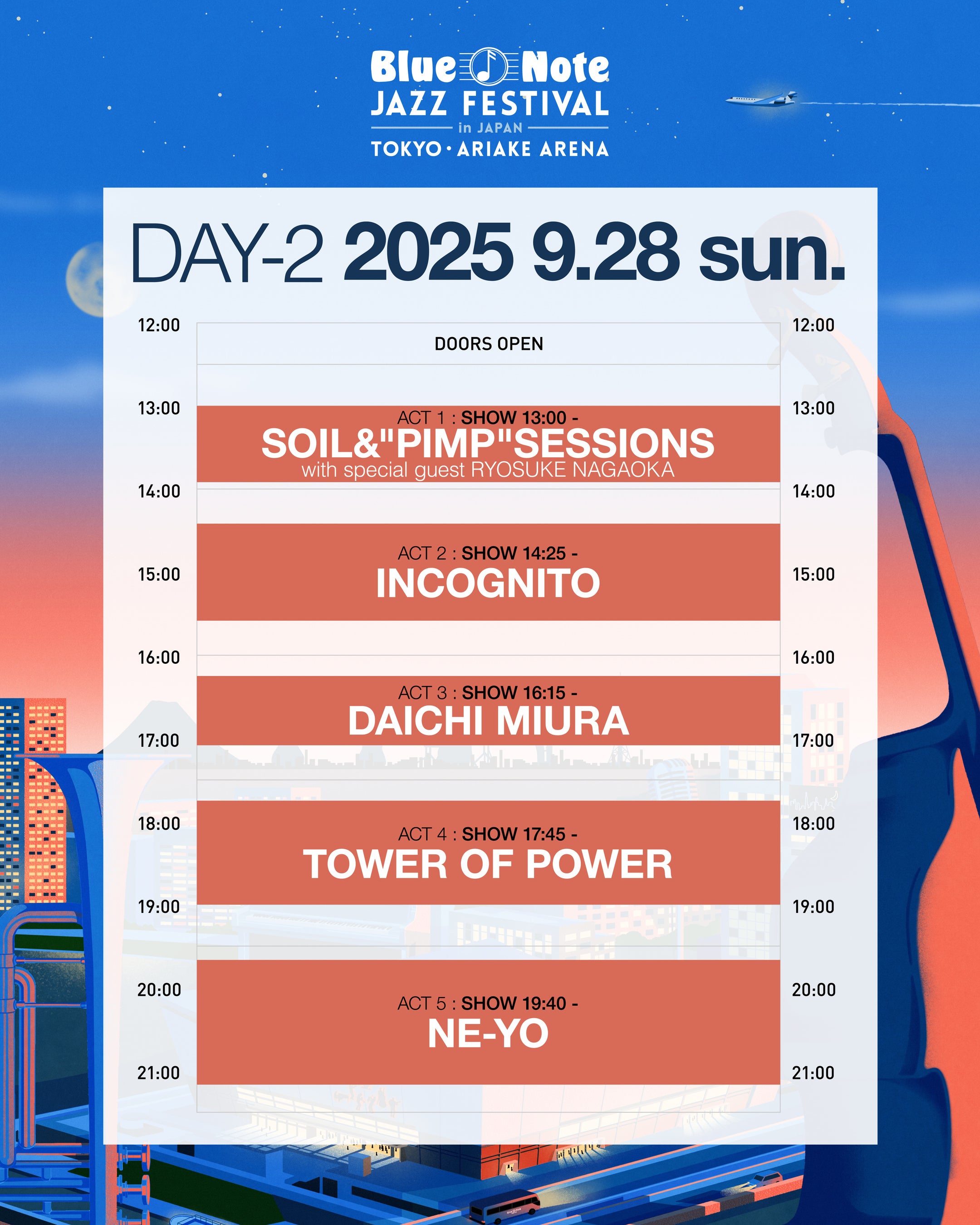 9⽉28⽇(⽇)は、31カ国で公演を⾏い世界と⽇本を繋ぐSOIL&"PIMP"SESSIONS が、多彩な活動を展開する神出⻤没の⾳楽家 ⻑岡亮介 をゲストに迎えて送るSOIL&"PIMP"SESSIONS with special guest ⻑岡亮介 がトップバッターを務め、 アシッド・ジャズ・シーンを牽引するUKジャズ・ファンクの最⾼峰 インコグニート 。 天性の歌声とリズム感、抜群の歌唱⼒と世界⽔準のダンスで⼈々を魅了するスーパーエンターテイナー 三浦⼤知 。“宇宙最強のファンク・バンド” タワー・オブ・パワー が登場し、3度のグラミー賞受賞、全世界で合計230億回ものストリーミング再⽣を記録、R&B界のトップ・シンガーソングライター/プロデューサー ニーヨ が今回関東での出演は唯⼀となるパフォーマンスを、フルセットで⾏い2⽇間のフェスティバルの幕を下ろす。