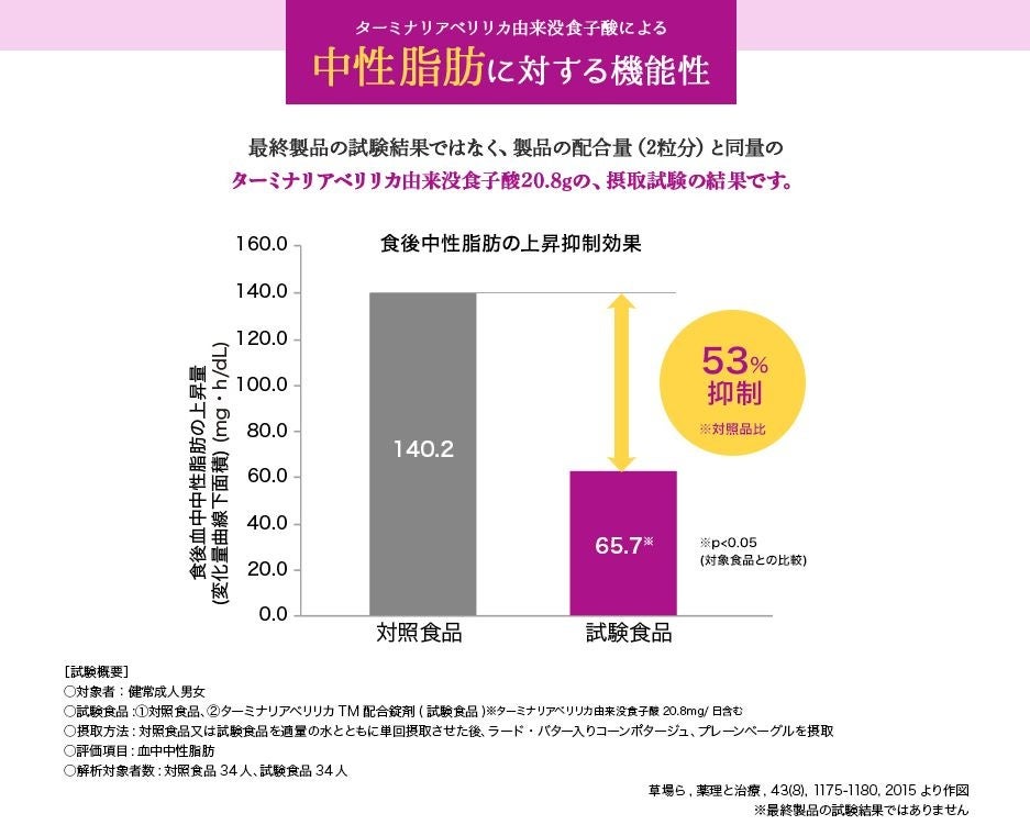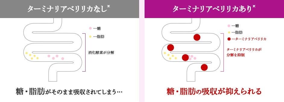 ターミナリアベリリカは、食事の脂肪と糖の吸収を抑制することで、食後に上がる血中の中性脂肪と糖の上昇を抑制します。