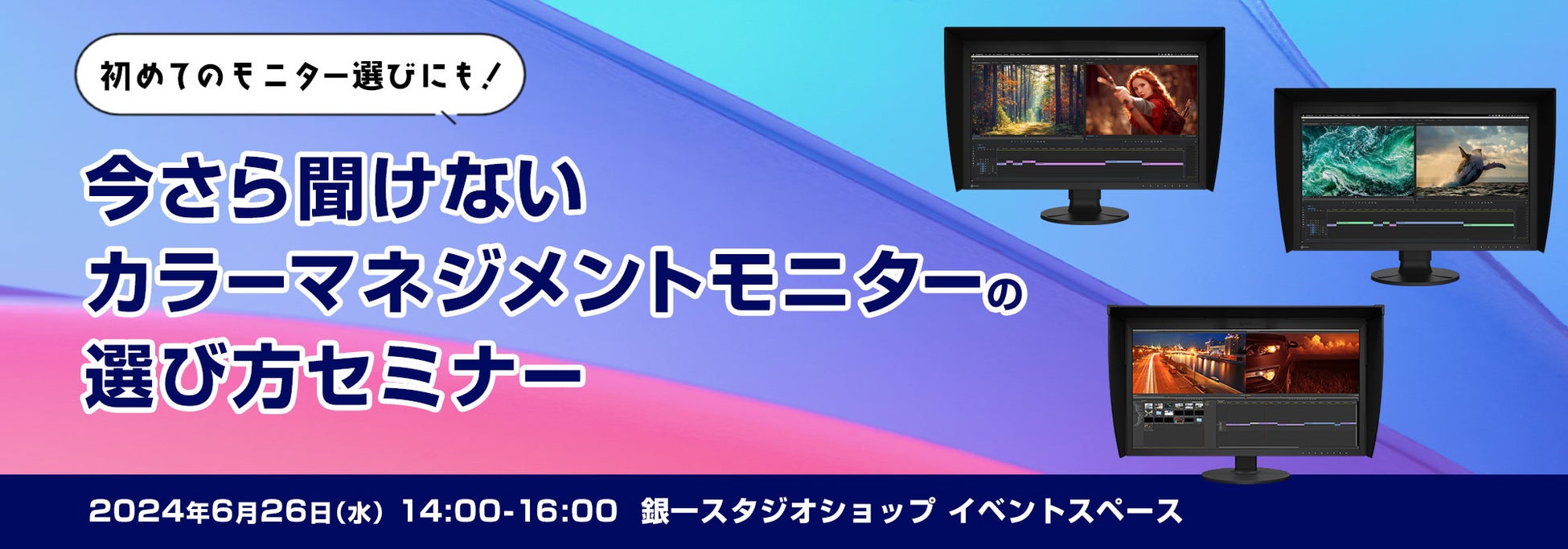 写真編集や動画編集の際に欠かせないカラーマネジメントモニターブランドのEIZOと、銀一スタジオショップがお届けする、ご自身に合ったモニターを探すための基礎知識を学ぶセミナーです。