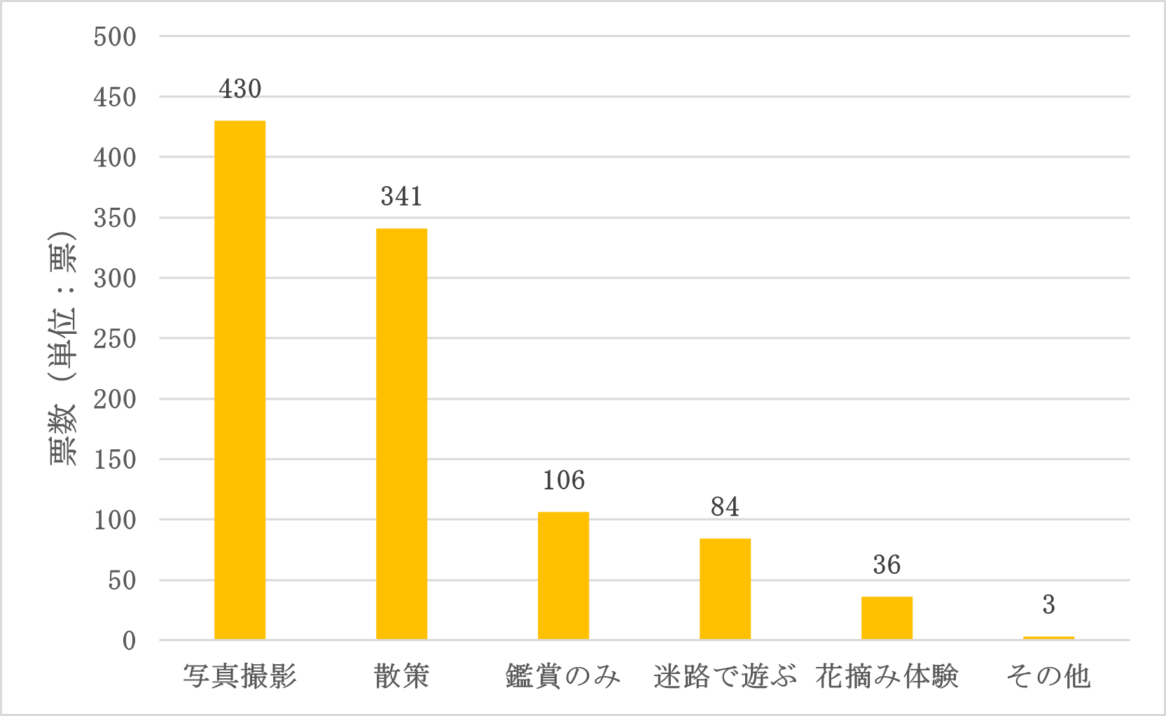 次に、2022年夏にひまわり畑に行くとしたら、何をしたいかを質問したところ、写真撮影が430票を獲得し第1位となりました。夏の青空をバックにたくさんのひまわりが咲き誇る絶景を、写真に収めたい人が多いことが明らかになりました。