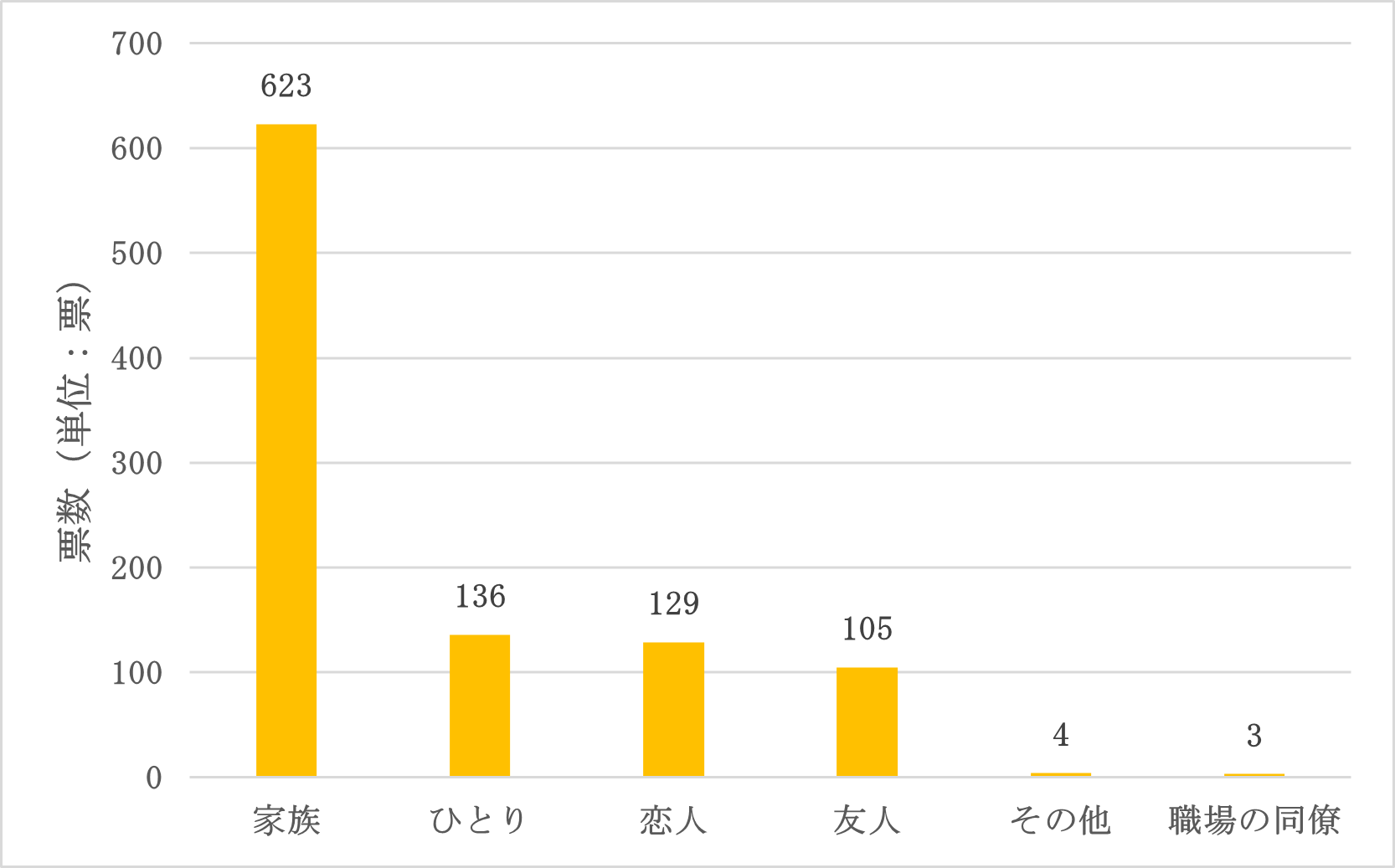 ランキングに合わせて、ひまわり畑に対する意識も調査。まず、2022年夏にひまわり畑に行くとしたら、誰と行きたいかを質問したところ、家族(623票)が第1位という結果でした。