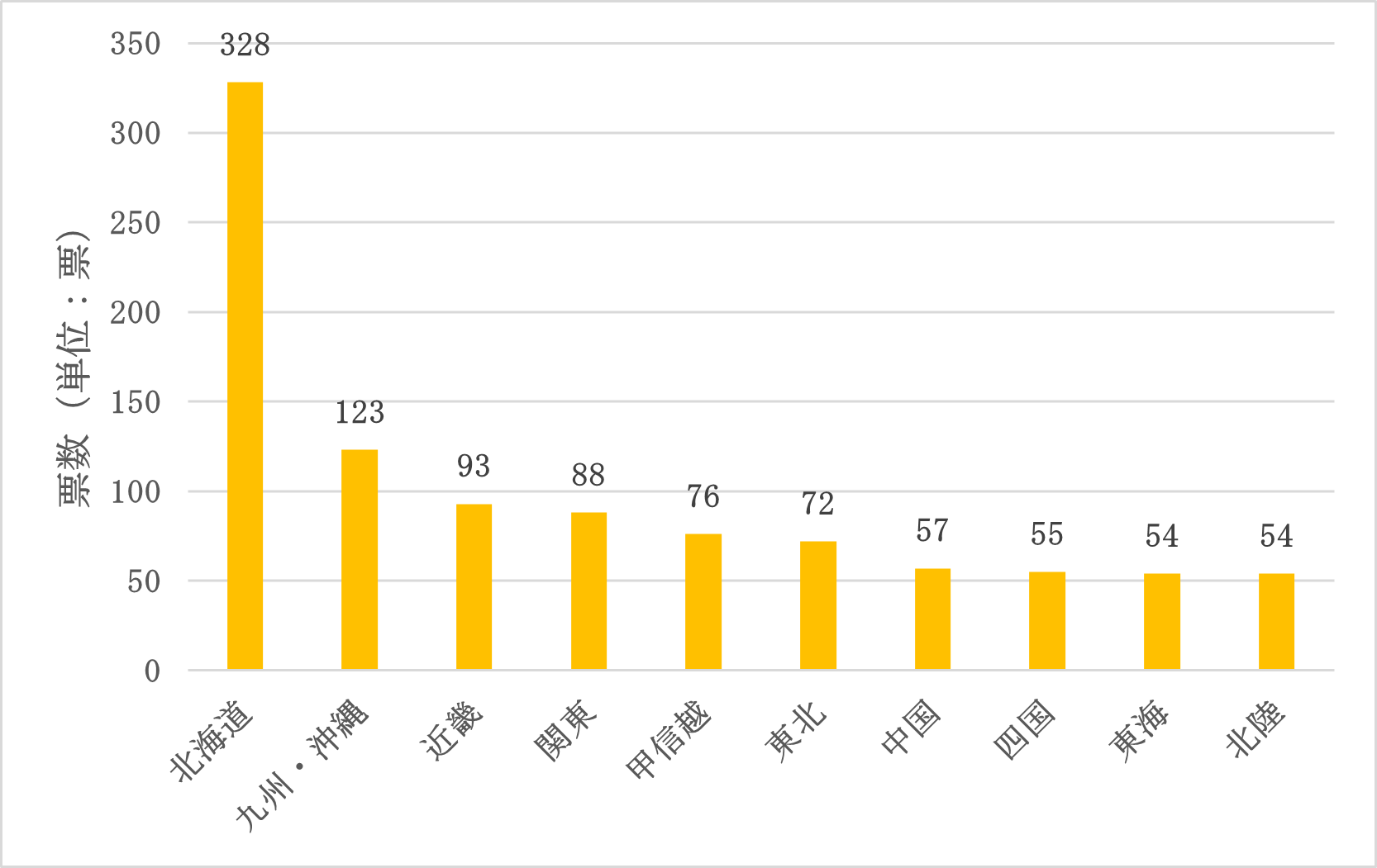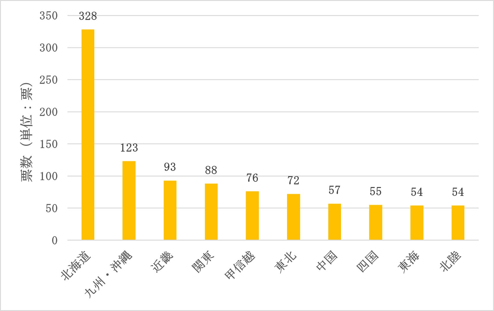 各地方の結果を見てみると、近場のひまわり畑の投票数が多く、各地方にあるひまわり畑が1位にランクインしていることがわかります。つまり、どの地方においても近場のひまわり畑が「日帰り旅行スポット」として人気があることが伺えます。