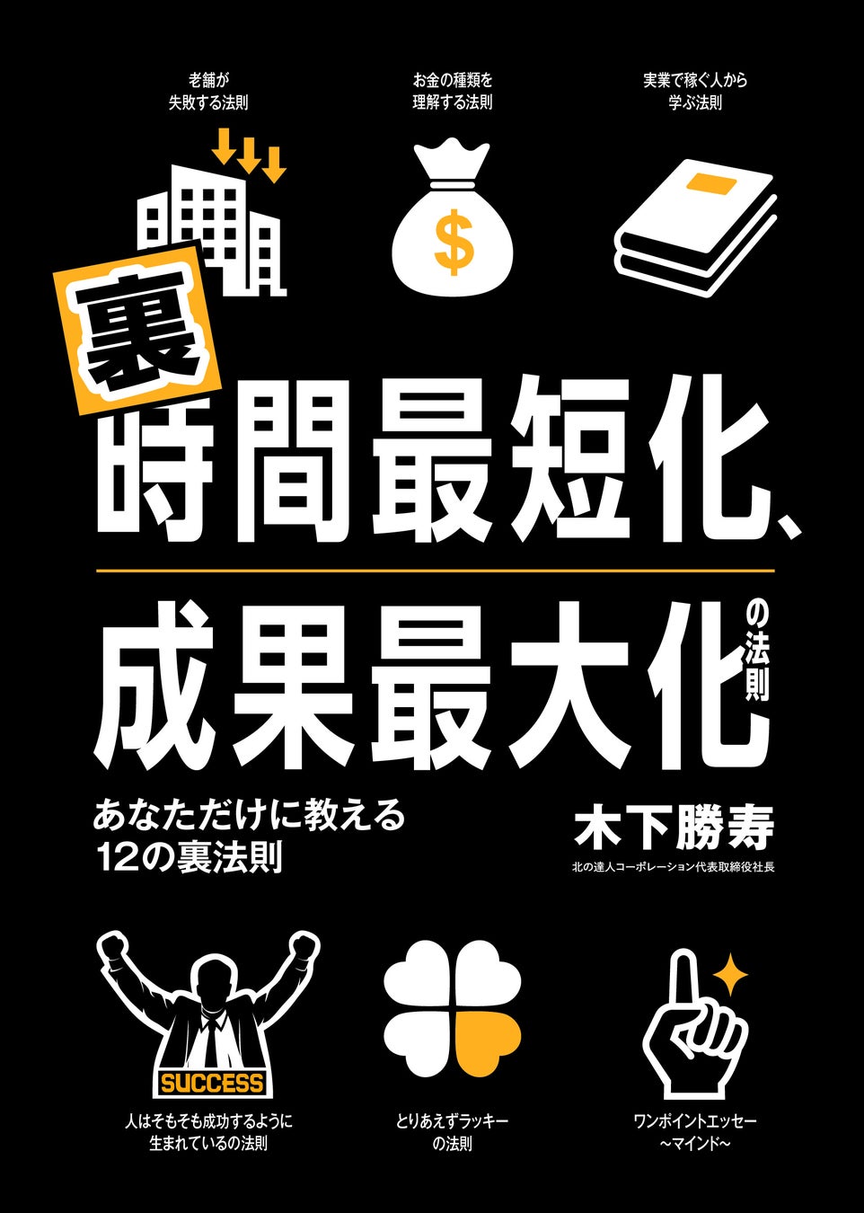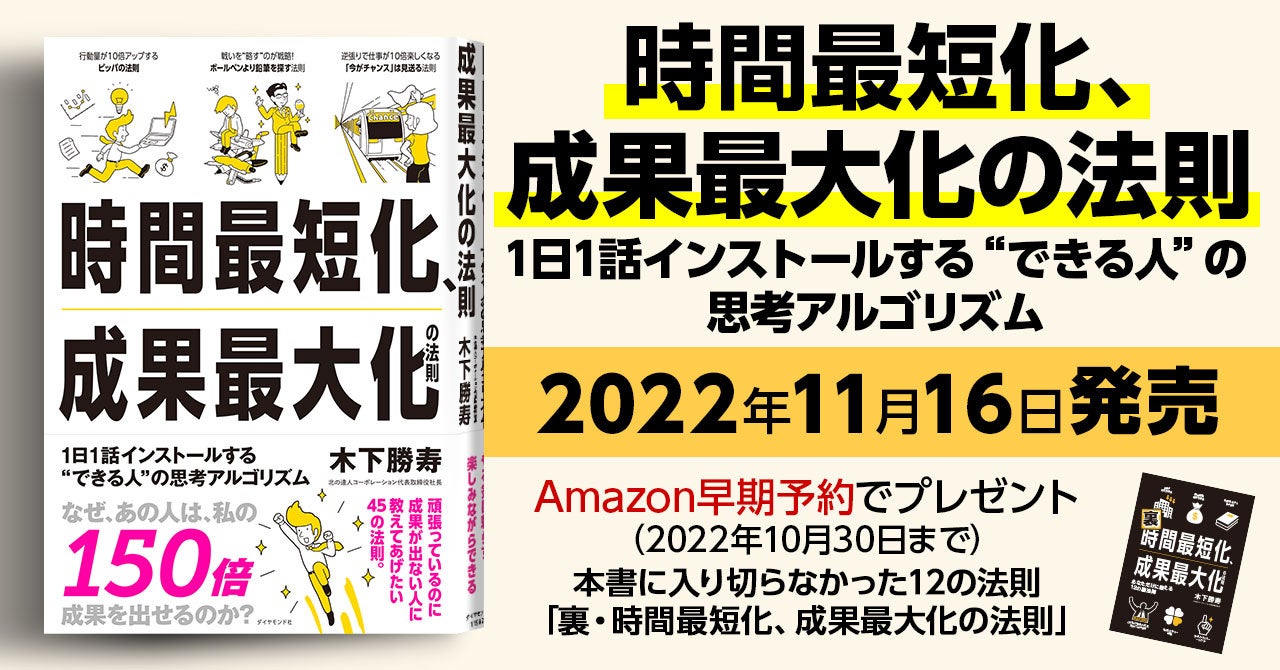株式会社北の達人コーポレーションの代表取締役社長である木下勝寿の書籍『時間最短化、成果最大化の法則─1日1話インストールする“できる人”の思考アルゴリズム』が、2022年11月16日にダイヤモンド社より発売されます。また、発売にともない、本書に入り切らなかった12の法則「裏・時間最短化、成果最大化の法則」(非売品)をPDF化してプレゼントするAmazon早期予約キャンペーンを実施いたします。