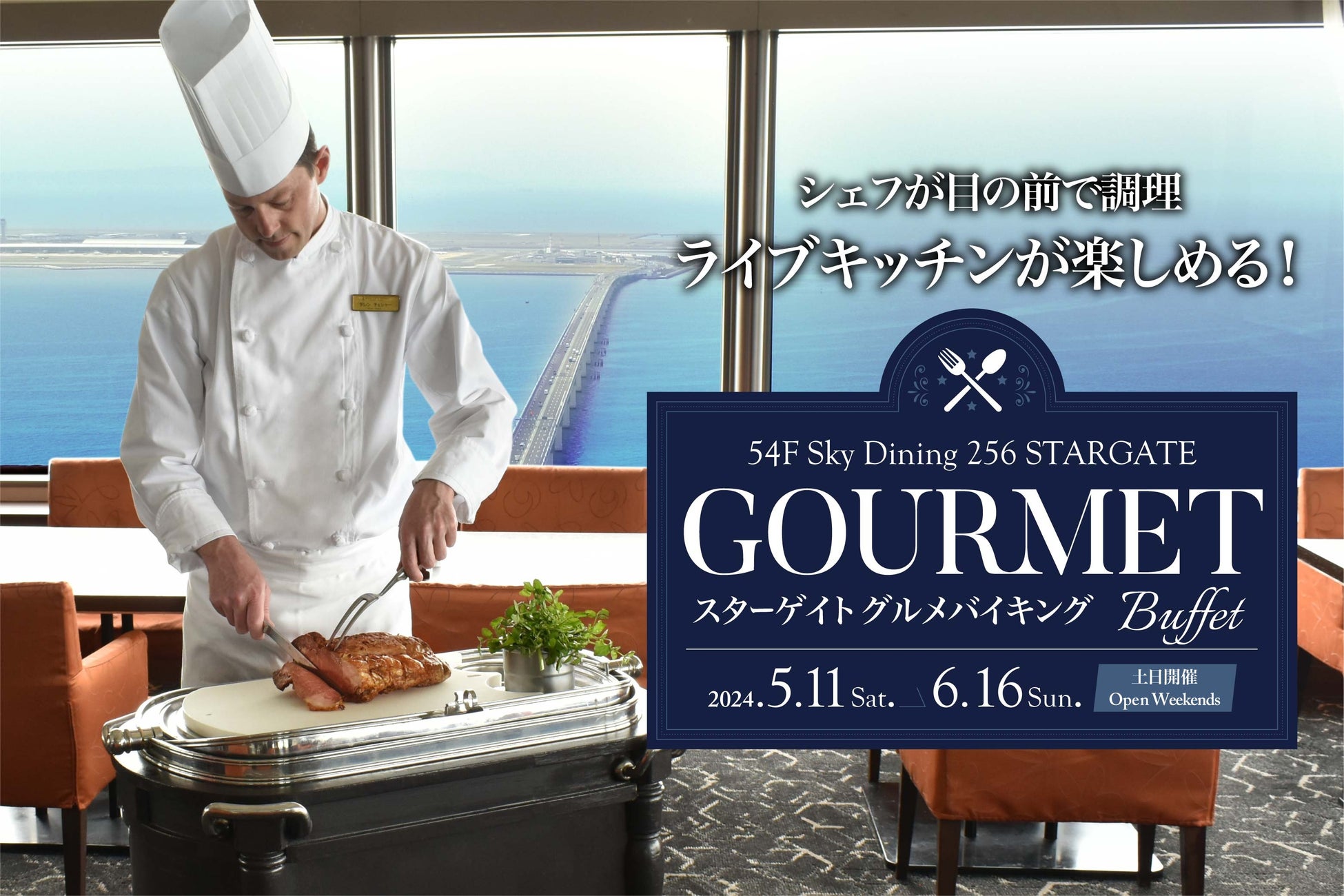 関西国際空港の対岸にある地上256mの超高層ランドマークタワー、スターゲイトホテル関西エアポート(所在地:大阪府泉佐野市りんくう往来北1番地)は、54階 スカイダイニング256「スターゲイト」にて、2024年5月11日(土)〜6月16日(日)までの土曜・日曜限定でライブキッチンが楽しめる「スターゲイトグルメバイキング」を開催いたします。
