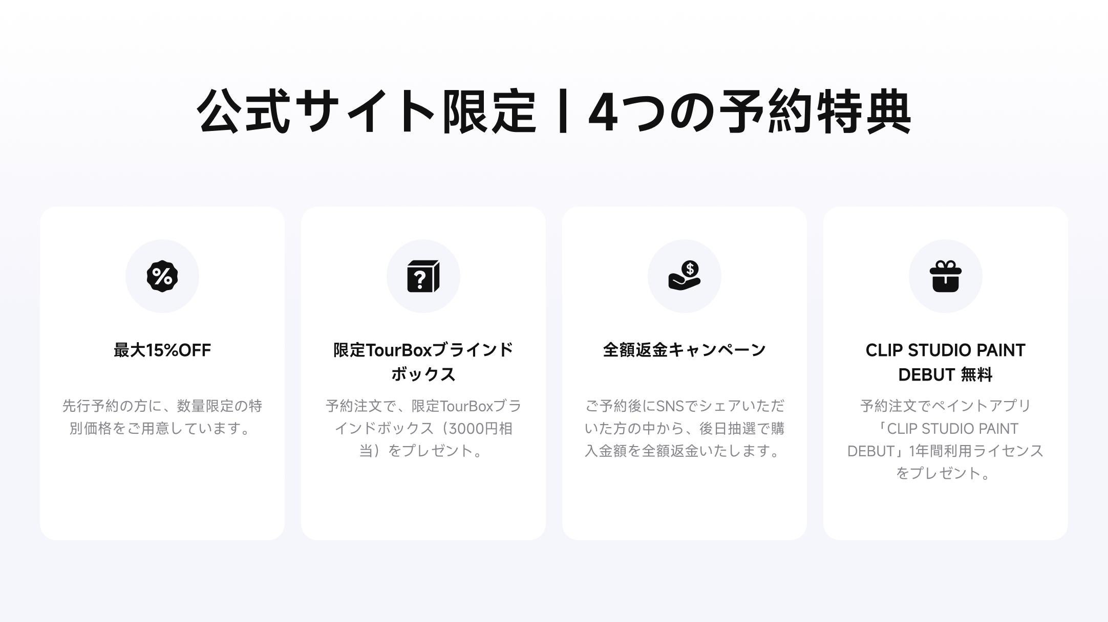 TourBox Elite Plusアークティックシリーズは11月18日午前9:00からTourBoxの公式サイトで予約受付を開始。期間限定で以下の4つの予約特典を実施中です: