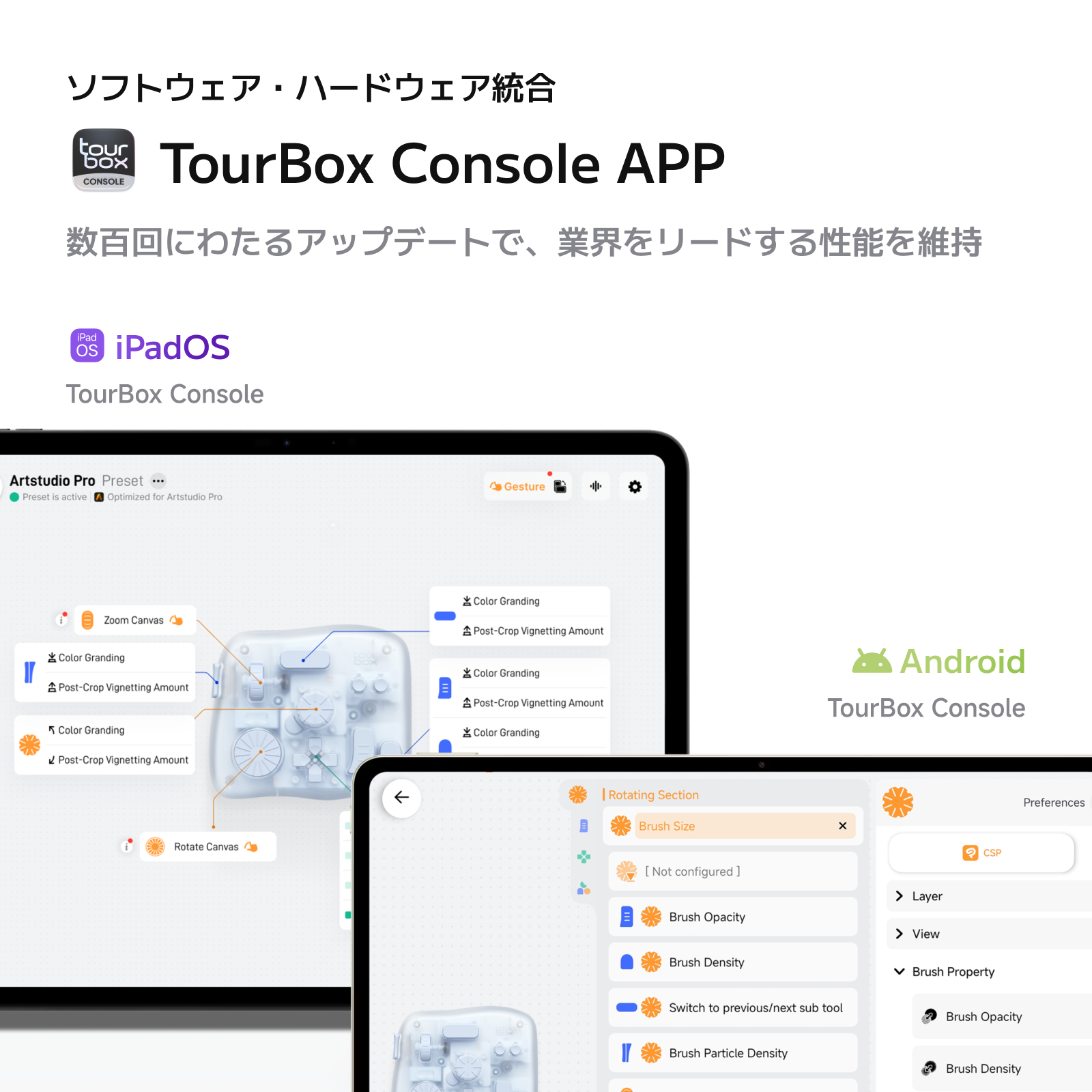 TourBox Elite PlusシリーズはペイントソフトCLIP STUDIO PAINT (クリスタ)とのiPadOS・macOS・Windows・Android の4プラットフォーム対応を実現しました。リリース予定のAndroid版TourBox Consoleにも、クリスタ専用プリセットを搭載予定で、より快適かつ直感的なお絵描き体験を提供します。