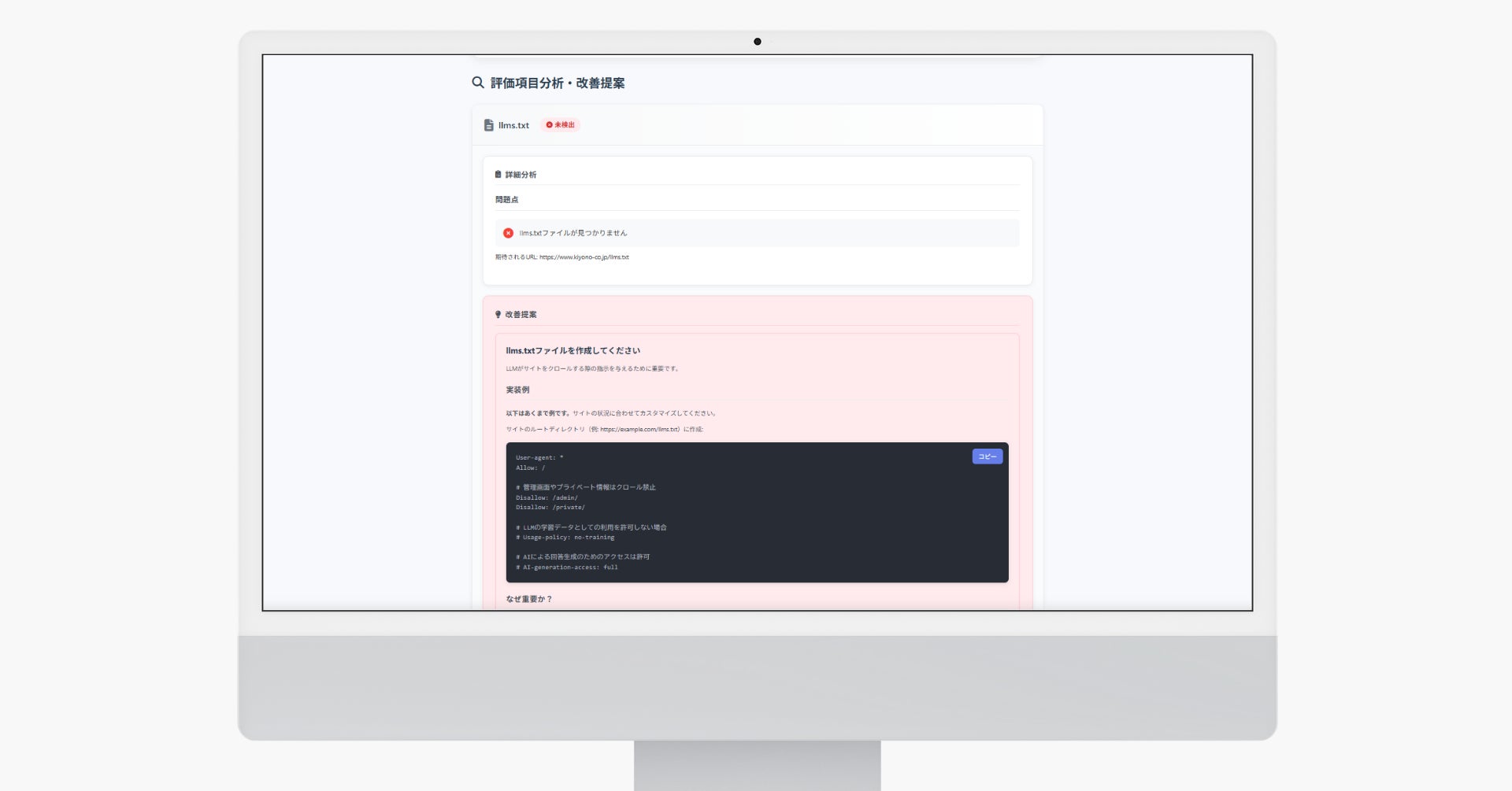 各項目で問題が検出された場合、具体的なHTMLコード例や実装方法を含む詳細な改善提案を自動生成。コピー&ペーストで使えるコード例も提供します。