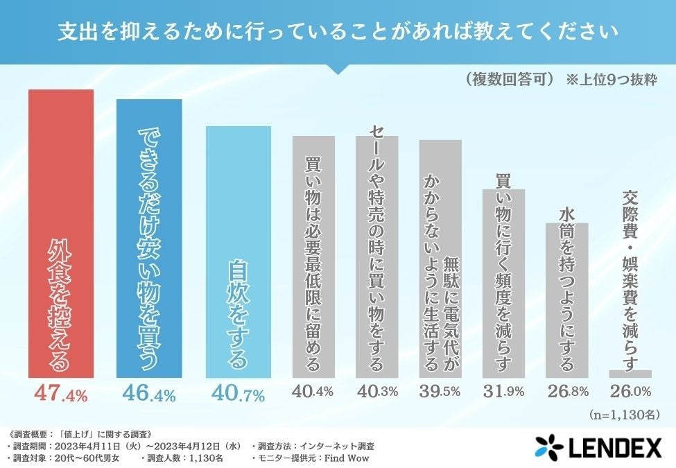 続いて、「支出を抑えるために行っていることがあれば教えてください(複数回答可)」と質問したところ、『外食を控える(47.4%)』と回答した方が最も多く、次いで『できるだけ安い物を買う(46.4%)』『自炊をする(40.7%)』『買い物は必要最低限に留める(40.4%)』『セールや特売の時に買い物をする(40.3%)』と続きました。